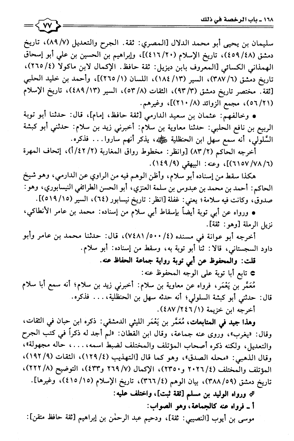 وهذا جيد في المتابعات، مُعَمَّر بن يَعْمَر الليثي الدمشقي: ذكره ابن حبان في الثقات، وقال: "يغرب"، وروى عنه جماعة، وقال ابن القطان: "لم أجد له ذكرًا في كتب الجرح والتعديل، ولكنه ذكره أصحاب المؤتلف والمختلف لضبط اسمه، ... ، حاله مجهولة"، وقال الذهبي: "محله الصدق"، وهو كما قال [التهذيب (٤/ ١٢٩)، الثقات (٩/ ١٩٢)، المؤتلف والمختلف (٤/ ٢٠٢٦ و ٢٣٥٠)، الإكمال (٧/ ٢٦٩ و ٤٣٣)، التوضيح (٨/ ٢٢٢)، تاريخ دمشق (٥٩/ ٣٨٨)، بيان الوهم (٤/ ٣٦٦)، تاريخ الإِسلام (١٥/ ٤١٥)، وغيرها].