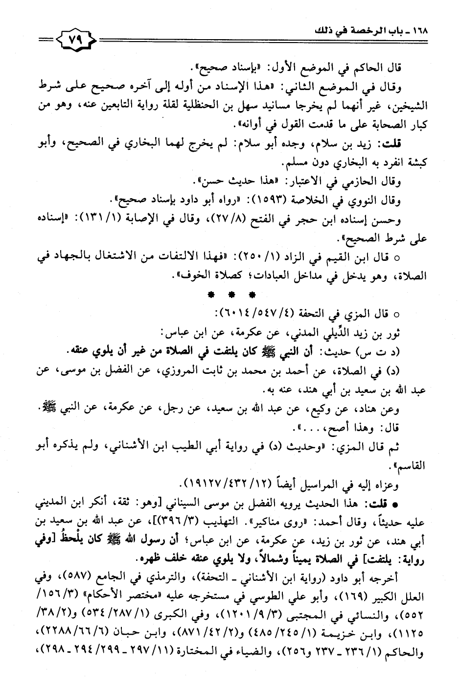 • قلت: هذا الحديث يرويه الفضل بن موسى السيناني [وهو: ثقة، أنكر ابن المديني عليه حديثًا، وقال أحمد: "روى مناكير". التهذيب (٣/ ٣٩٦)]، عن عبد الله بن سعيد بن أبي هند، عن ثور بن زيد، عن عكرمة، عن ابن عباس؛ أن رسول الله - صلى الله عليه وسلم - كان يلْحظُ [وفي رواية: يلتفت] في الصلاة يمينًا وشمالًا، ولا يلوي عنقه خلف ظهره.