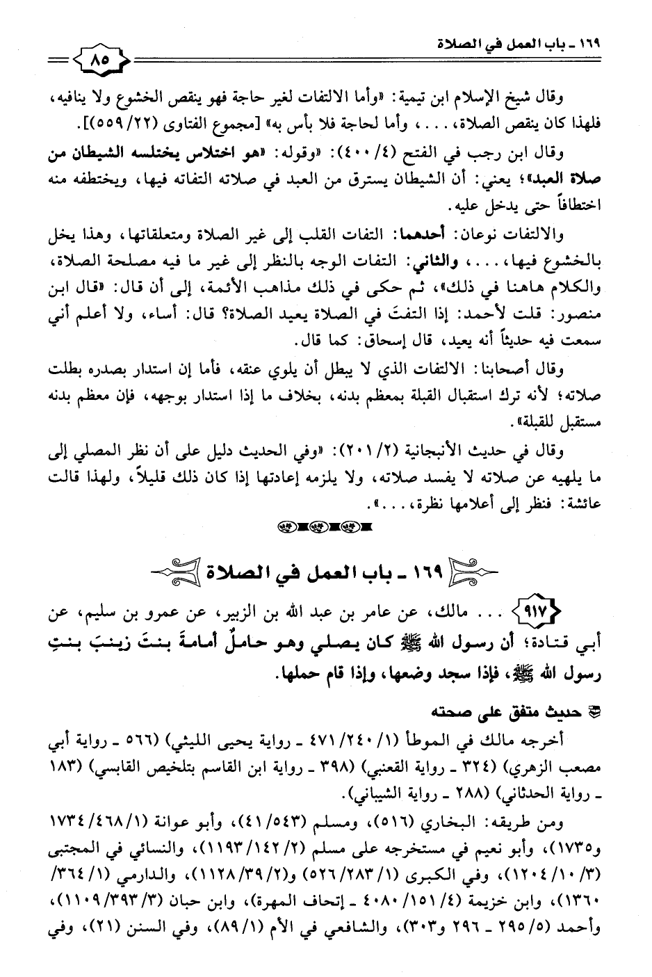 ٩١٧ - . . . مالك، عن عامر بن عبد الله بن الزبير، عن عمرو بن سليم، عن أبي قتادة؛ أن رسول الله - صلى الله عليه وسلم - كان يصلي وهو حاملٌ أمامةَ بنتَ زينبَ بنتِ رسول الله - صلى الله عليه وسلم -، فإذا سجد وضعها، وإذا قام حملها.