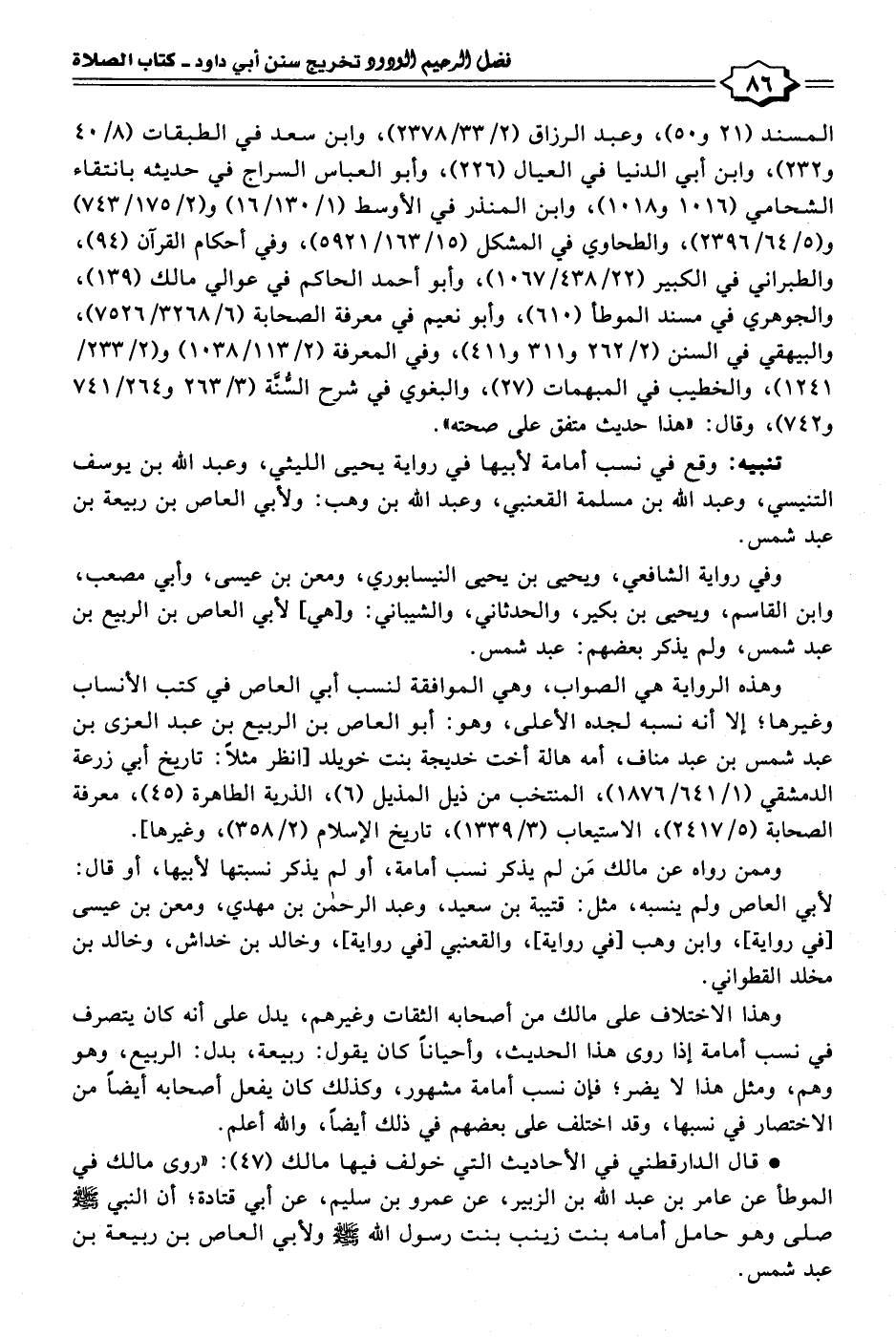 • قال الدارقطني في الأحاديث التي خولف فيها مالك (٤٧): "روى مالك في الموطأ عن عامر بن عبد الله بن الزبير، عن عمرو بن سليم، عن أبي قتادة؛ أن النبي - صلى الله عليه وسلم - صلى وهو حامل أمامه بنت زينب بنت رسول الله - صلى الله عليه وسلم - ولأبي العاص بن ربيعة بن عبد شمس.