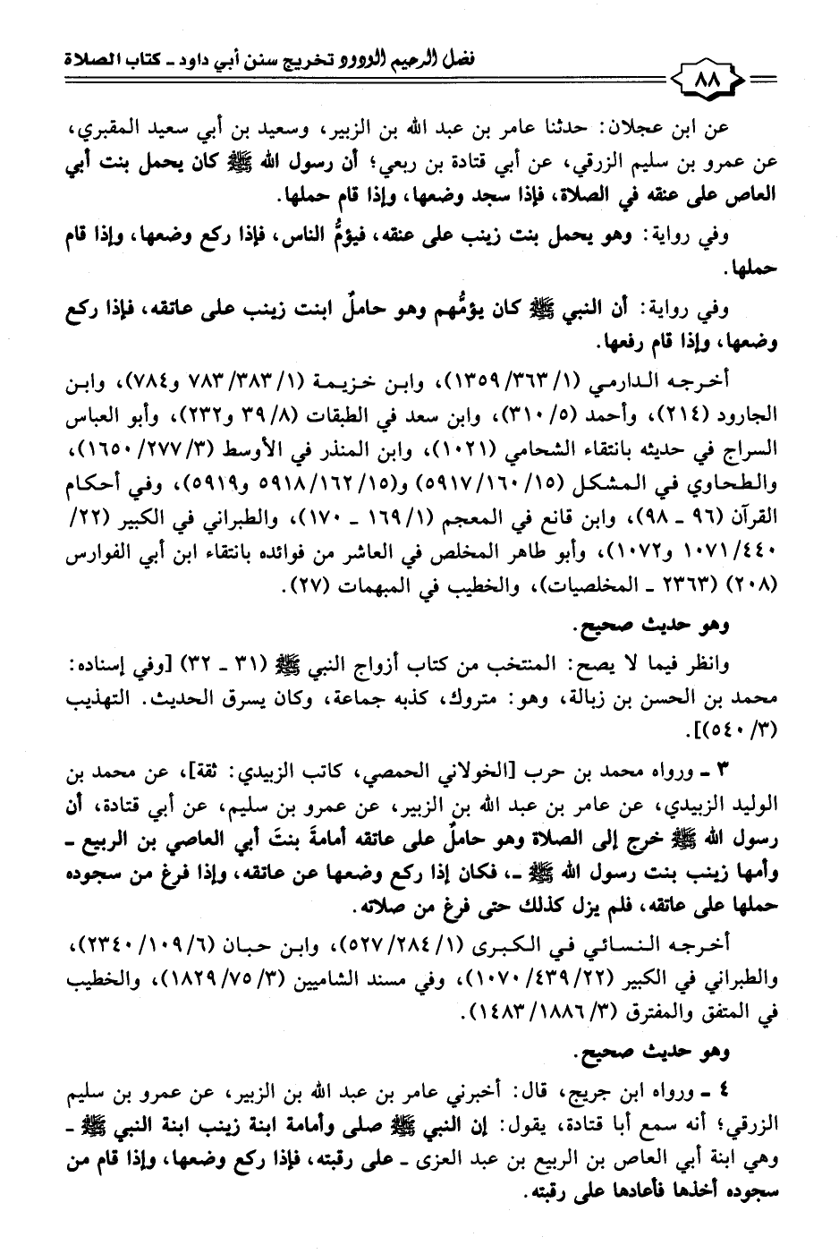٣ - ورواه محمَّد بن حرب [الخولاني الحمصي، كاتب الزبيدي: ثقة]، عن محمَّد بن الوليد الزبيدي، عن عامر بن عبد الله بن الزبير، عن عمرو بن سليم، عن أبي قتادة، أن رسول الله - صلى الله عليه وسلم - خرج إلى الصلاة وهو حامل على عاتقه أمامةَ بنتَ أبي العاصي بن الربيع- وأمها زينب بنت رسول الله - صلى الله عليه وسلم -، فكان إذا ركع وضعها عن عاتقه، وإذا فرغ من سجوده حملها على عاتقه، فلم يزل كذلك حتى فرغ من صلاته.