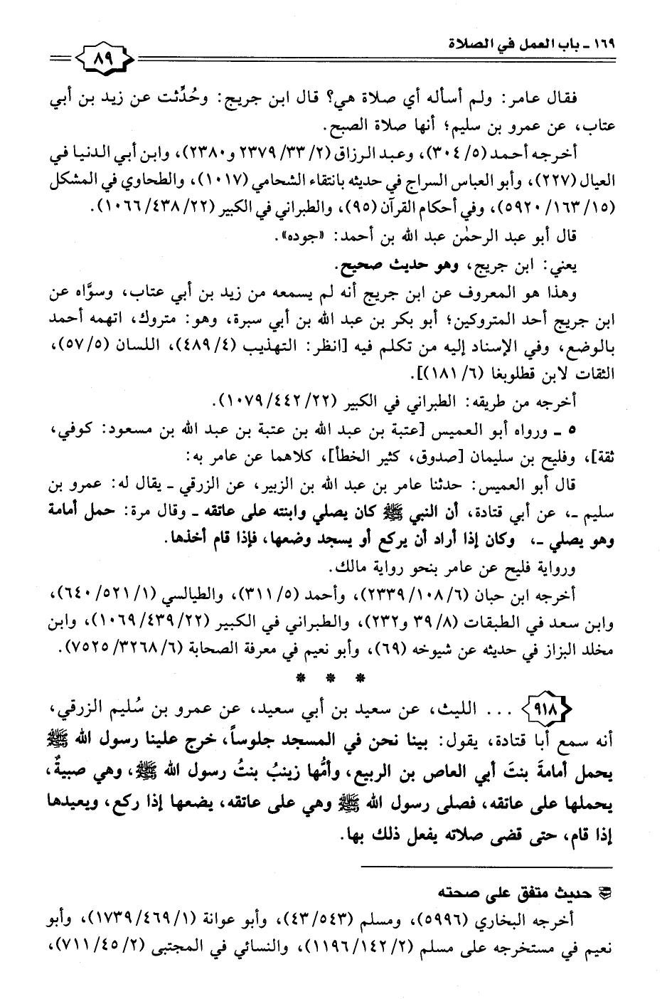 ٩١٨ - . . . الليث، عن سعيد بن أبي سعيد، عن عمرو بن سُليم الزرقي، أنه سمع أبا قتادة، يقول: بينا نحن في المسجد جلوسًا، خرج علينا رسول الله - صلى الله عليه وسلم - يحمل أمامةَ بنتَ أبي العاص بن الربيع، وأمُّها زينبُ بنتُ رسول الله - صلى الله عليه وسلم -، وهي صبيةٌ، يحملها على عاتقه، فصلى رسول الله - صلى الله عليه وسلم - وهي على عاتقه، يضعها إذا ركع، ويعيدها إذا قام، حتى قضى صلاته يفعل ذلك بها.