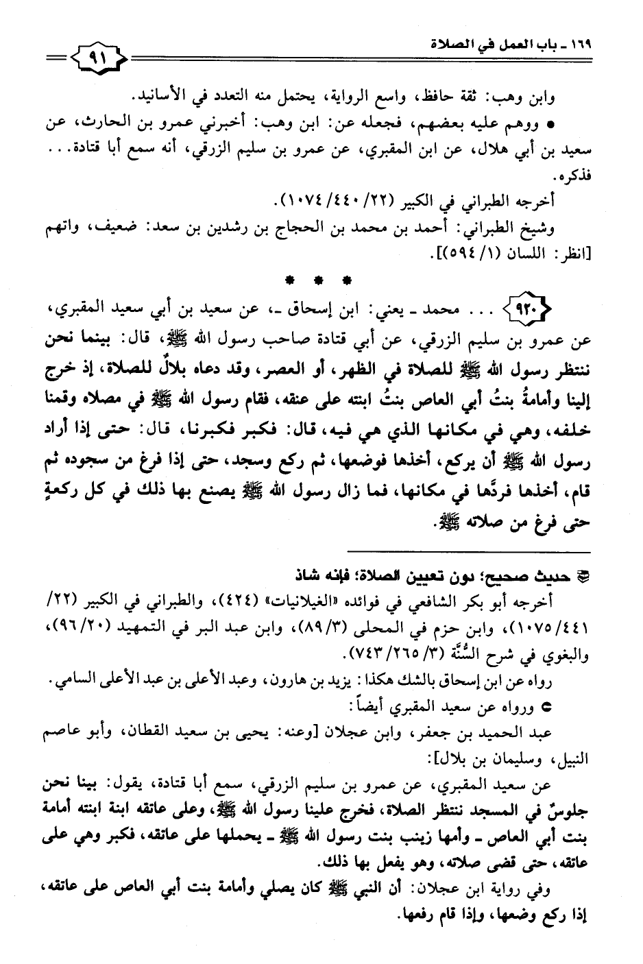 ٩٢٠ - . . . محمَّد -يعني: ابن إسحاق-، عن سعيد بن أبي سعيد المقبري، عن عمرو بن سليم الزرقي، عن أبي قتادة صاحب رسول الله - صلى الله عليه وسلم -، قال: بينما نحن ننتظر رسول الله - صلى الله عليه وسلم - للصلاة في الظهر، أو العصر، وقد دعاه بلالٌ للصلاة، إذ خرج إلينا وأمامةُ بنتُ أبي العاص بنتُ ابنته على عنقه، فقام رسول الله - صلى الله عليه وسلم - في مصلاه وقمنا خلفه، وهي في مكانها الذي هي فيه، قال: فكبر فكبرنا، قال: حتى إذا أراد رسول الله - صلى الله عليه وسلم - أن يركع، أخذها فوضعها، ثم ركع وسجد، حتى إذا فرغ من سجوده ثم قام، أخذها فردَّها في مكانها، فما زال رسول الله - صلى الله عليه وسلم - يصنع بها ذلك في كل ركعةٍ حتى فرغ من صلاته - صلى الله عليه وسلم -.