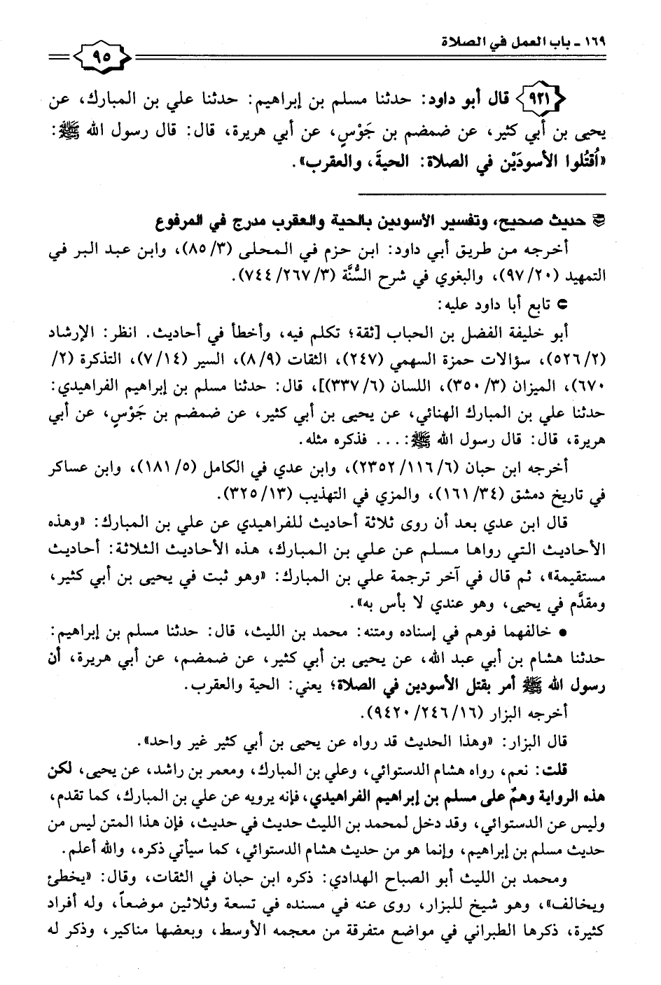 ٩٢١ - قال أبو داود: حدثنا مسلم بن إبراهيم: حدثنا علي بن المبارك، عن يحيى بن أبي كثير، عن ضمضم بن جَوْسٍ، عن أبي هريرة، قال: قال رسول الله - صلى الله عليه وسلم -: "اُقتُلوا الأسودَيْن في الصلاة: الحيةَ، والعقرب".