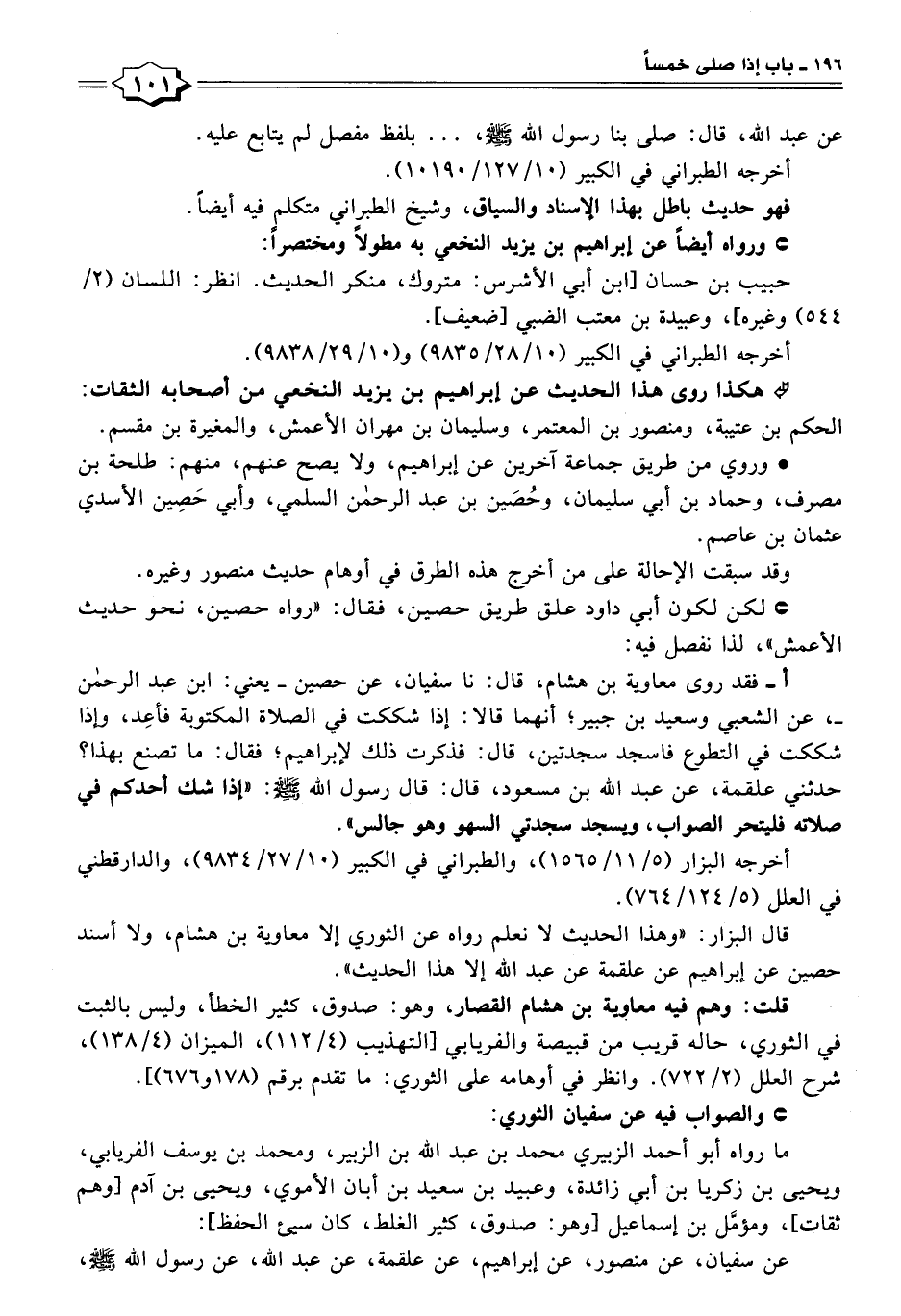 قال البزار: "وهذا الحديث لا نعلم رواه عن الثوري إلا معاوية بن هشام، ولا أسند حصين عن إبراهيم عن علقمة عن عبد الله إلا هذا الحديث".