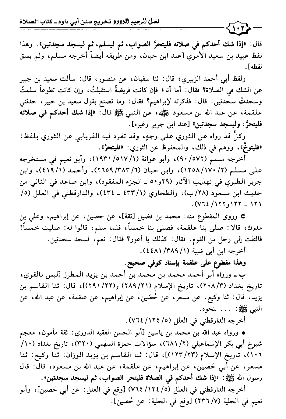 • ورواه عبد الله بن محمد بن ياسين [أبو الحسن الفقيه الدوري: ثقة مأمون، معجم شيوخ أبي بكر الإسماعيلي (٢/ ٦٨١)، سؤالات حمزة السهمي (٣٢٠)، تاريخ بغداد (١٠/ ١٠٦)، تاريخ الإسلام (٢٣/ ١٢٣)]، قال: ثنا القاسم بن يزيد الوزان: ثنا وكيع: ثنا مسعر، عن أبي حَصين، عن إبراهيم، عن علقمة، عن عبد الله بن مسعود، قال: قال رسول الله - صلى الله عليه وسلم -: "إذا شك أحدكم في الصلاة فليتحر الصواب، ثم ليسجد سجدتين".