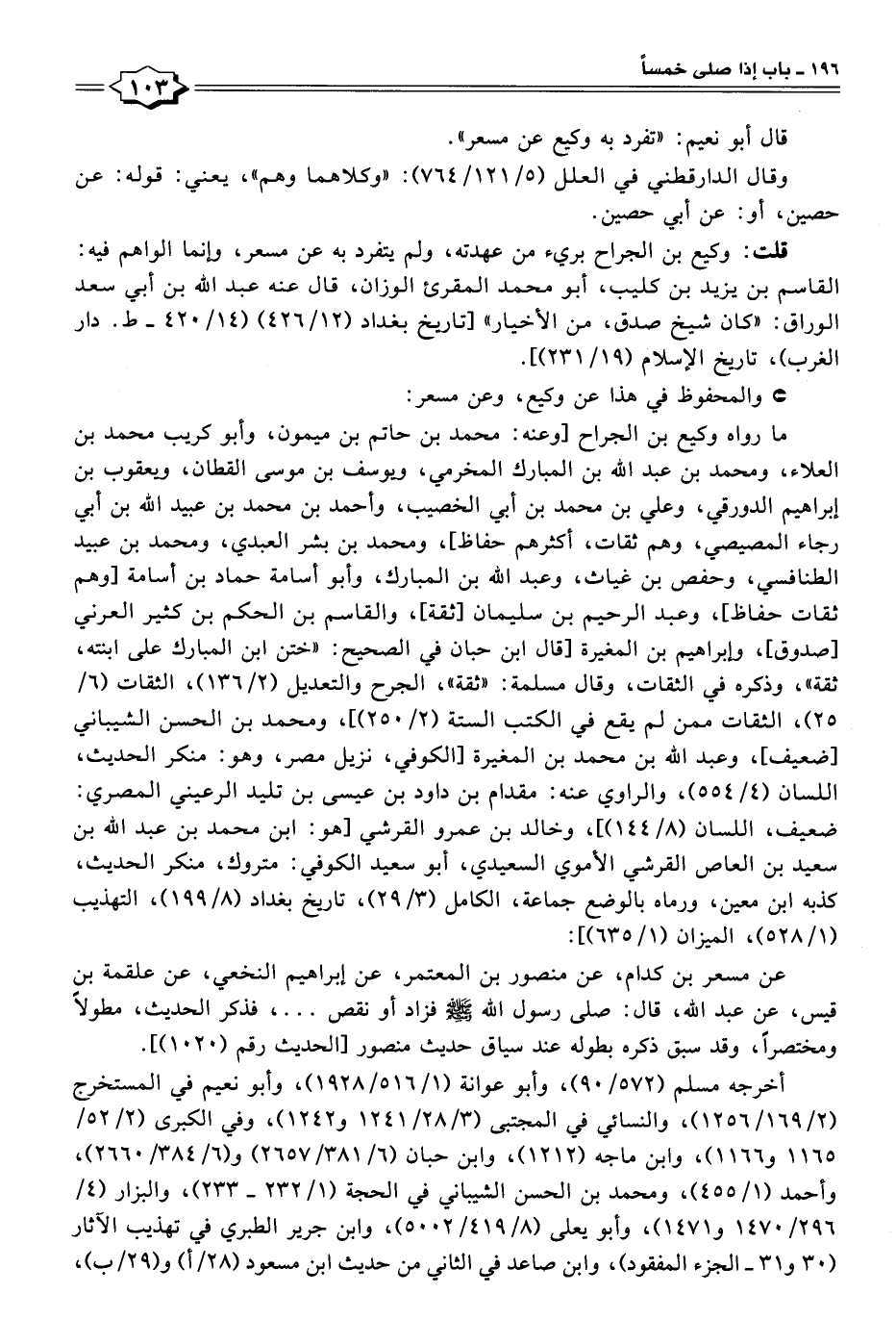 ما رواه وكيع بن الجراح [وعنه: محمد بن حاتم بن ميمون، وأبو كريب محمد بن العلاء، ومحمد بن عبد الله بن المبارك المخرمي، ويوسف بن موسى القطان، ويعقوب بن إبراهيم الدورقي، وعلي بن محمد بن أبي الخصيب، وأحمد بن محمد بن عبيد الله بن أبي رجاء المصيصي، وهم ثقات، أكثرهم حفاظ]، ومحمد بن بشر العبدي، ومحمد بن عبيد الطنافسي، وحفص بن غياث، وعبد الله بن المبارك، وأبو أسامة حماد بن أسامة [وهم ثقات حفاظ]، وعبد الرحيم بن سليمان [ثقة]، والقاسم بن الحكم بن كثير العرني [صدوق]، وإبراهيم بن المغيرة [قال ابن حبان في الصحيح: "ختن ابن المبارك على ابنته، ثقة"، وذكره في الثقات، وقال مسلمة: "ثقة"، الجرح والتعديل (٢/ ١٣٦)، الثقات (٦/ ٢٥)، الثقات ممن لم يقع في الكتب الستة (٢/ ٢٥٠)]، ومحمد بن الحسن الشيباني [ضعيف]، وعبد الله بن محمد بن المغيرة [الكوفي، نزيل مصر، وهو: منكر الحديث، اللسان (٤/ ٥٥٤)، والراوي عنه: مقدام بن داود بن عيسى بن تليد الرعيني المصري: ضعيف، اللسان (٨/ ١٤٤)]، وخالد بن عمرو القرشي [هو: ابن محمد بن عبد الله بن سعيد بن العاص القرشي الأموي السعيدي، أبو سعيد الكوفي: متروك، منكر الحديث، كذبه ابن معين، ورماه بالوضع جماعة، الكامل (٣/ ٢٩)، تاريخ بغداد (٨/ ١٩٩)، التهذيب (١/ ٥٢٨)، الميزان (١/ ٦٣٥)]: