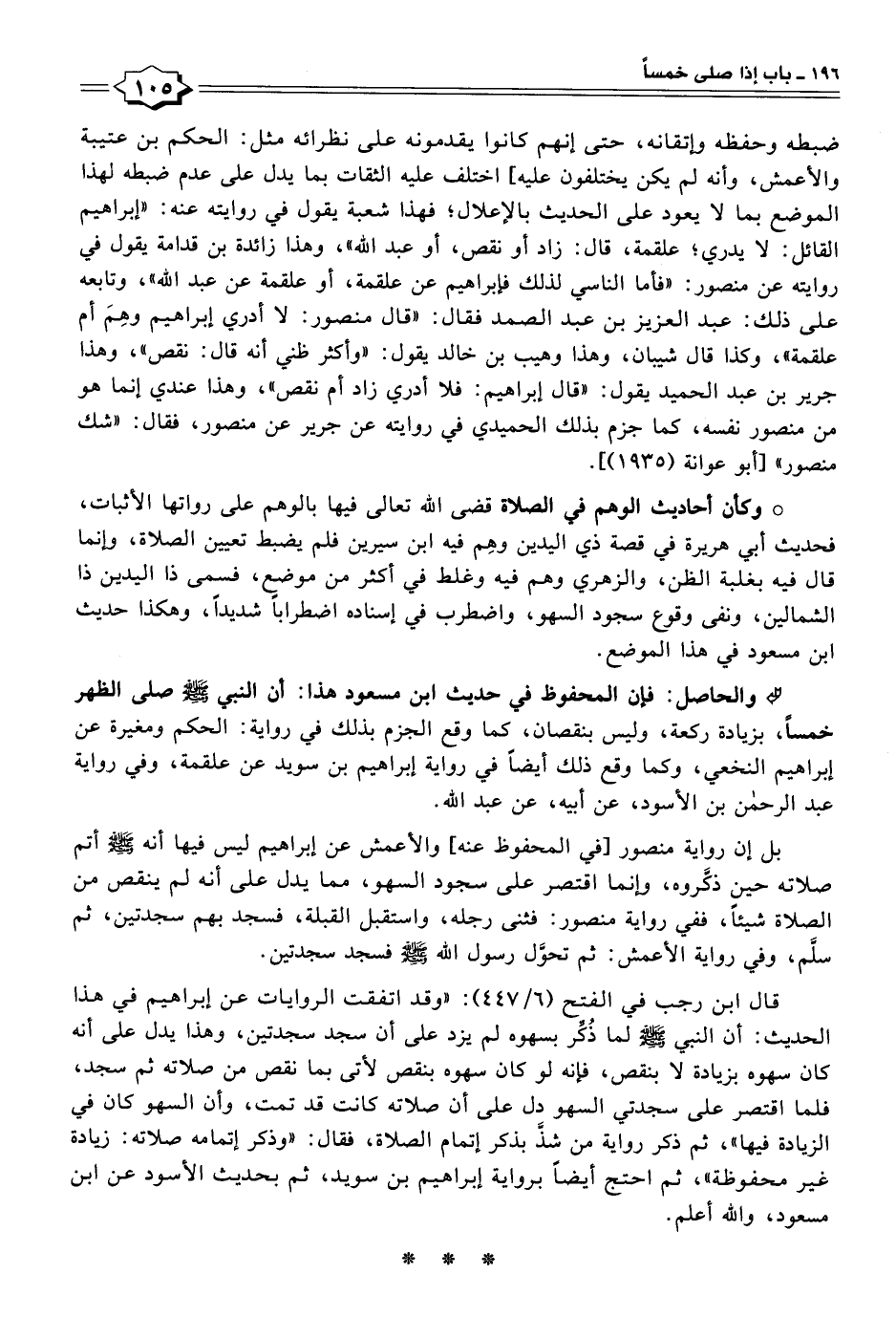 * والحاصل: فإن المحفوظ في حديث ابن مسعود هذا: أن النبي - صلى الله عليه وسلم - صلى الظهر خمسًا، بزيادة ركعة، وليس بنقصان، كما وقع الجزم بذلك في رواية: الحكم ومغيرة عن إبراهيم النخعي، وكما وقع ذلك أيضًا في رواية إبراهيم بن سويد عن علقمة، وفي رواية عبد الرحمن بن الأسود، عن أبيه، عن عبد الله.