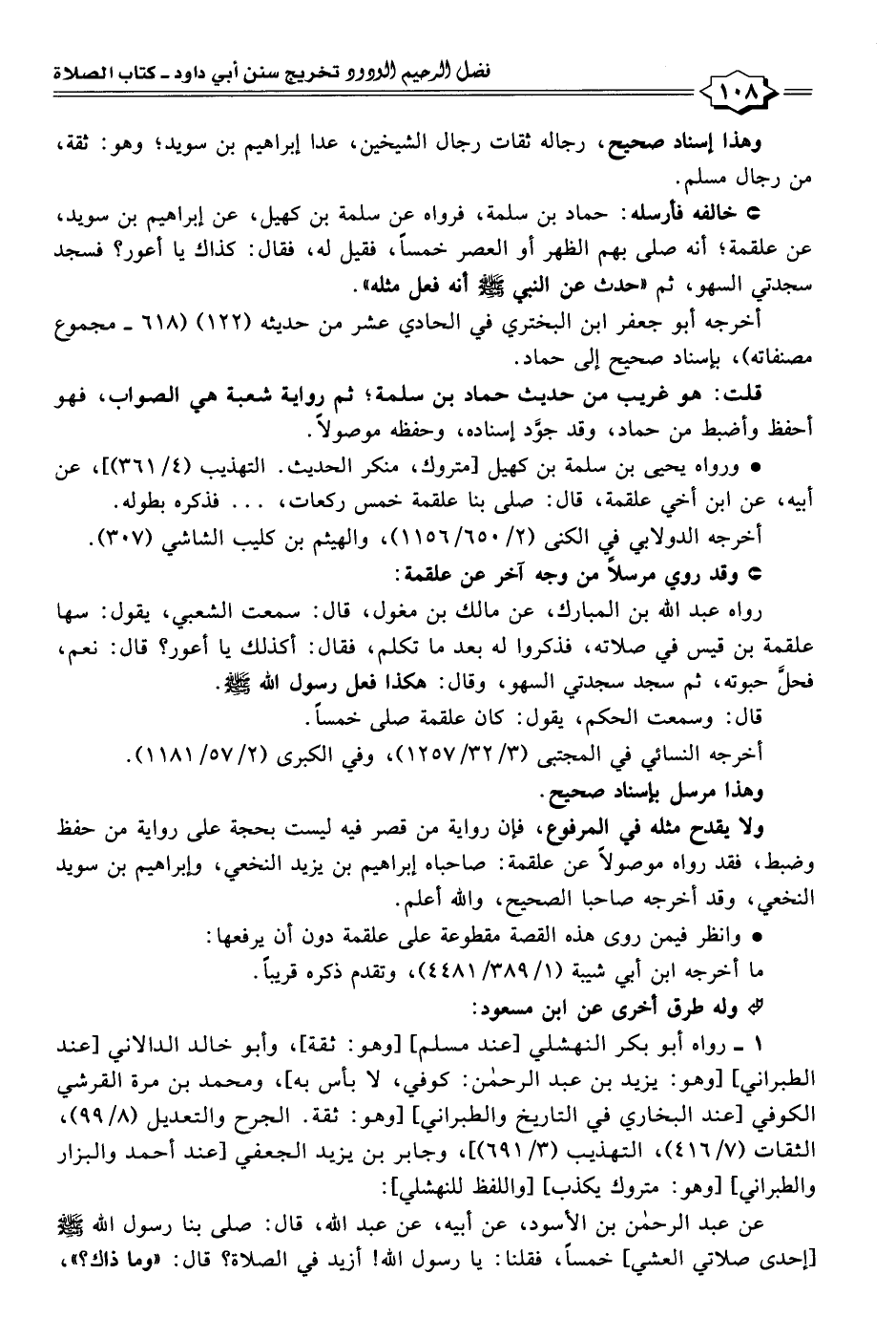 * خالفه فأرسله: حماد بن سلمة، فرواه عن سلمة بن كهيل، عن إبراهيم بن سويد، عن علقمة؛ أنه صلى بهم الظهر أو العصر خمسًا، فقيل له، فقال: كذاك يا أعور؟ فسجد سجدتي السهو، ثم "حدث عن النبي - صلى الله عليه وسلم - أنه فعل مثله".