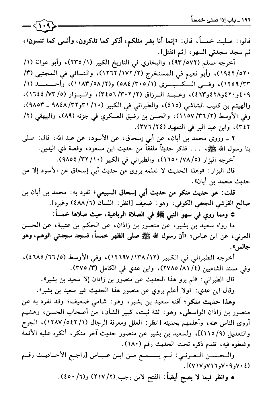 * ومما روي في سهو النبي - صلى الله عليه وسلم - في الصلاة الرباعية، حيث صلاها خمسًا: