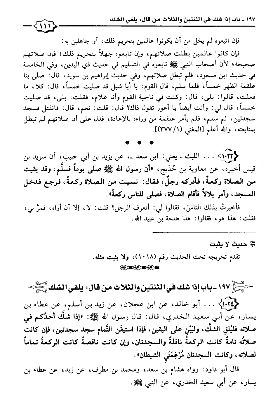 ١٠٢٣ - الليث - يعني: ابن سعد -، عن يزيد بن أبي حبيب، أن سويد بن قيس أخبره، عن معاوية بن حُدَيج، "أن رسول الله - صلى الله عليه وسلم - يومًا فسلَّم، وقد بقيت من الصلاة ركعةٌ، فأدركه رجلٌ، فقال: نسيت من الصلاة ركعةً، فرجع فدخل المسجد، وأمر بلالًا فأقام الصلاة، فصلى للناس ركعةً".