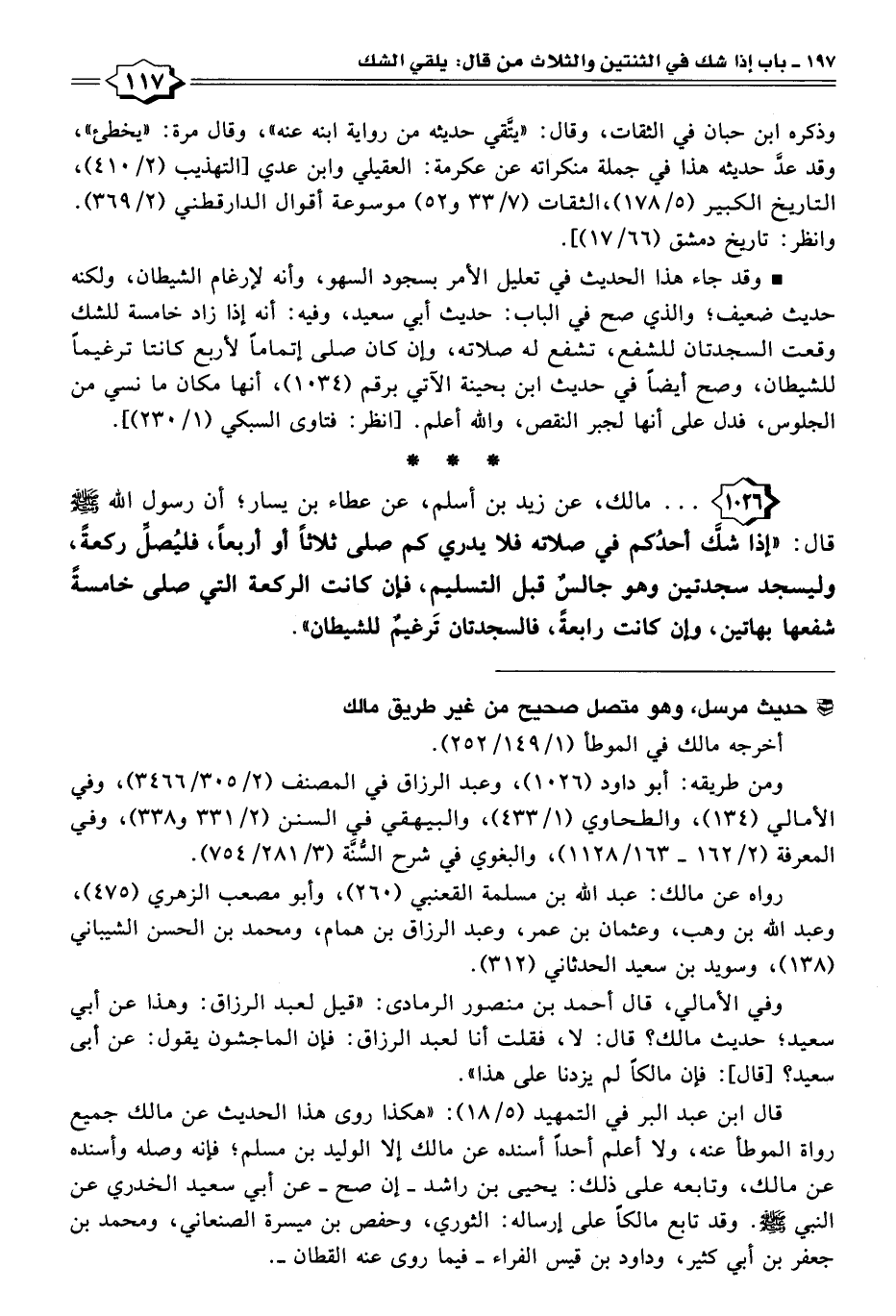 ١٠٢٦ - . . . مالك، عن زيد بن أسلم، عن عطاء بن يسار؛ أن رسول الله - صلى الله عليه وسلم - قال: [إذا شك أحدُكم في صلاته فلا يدري كم صلى ثلاثًا أو أربعًا، فليُصلِّ ركعةً، وليسجد سجدتين وهو جالسٌ قبل التسليم، فإن كانت الركعة التي صلى خامسةً شفعها بهاتين، وإن كانت رابعةً، فالسجدتان ترغيمٌ للشيطان".