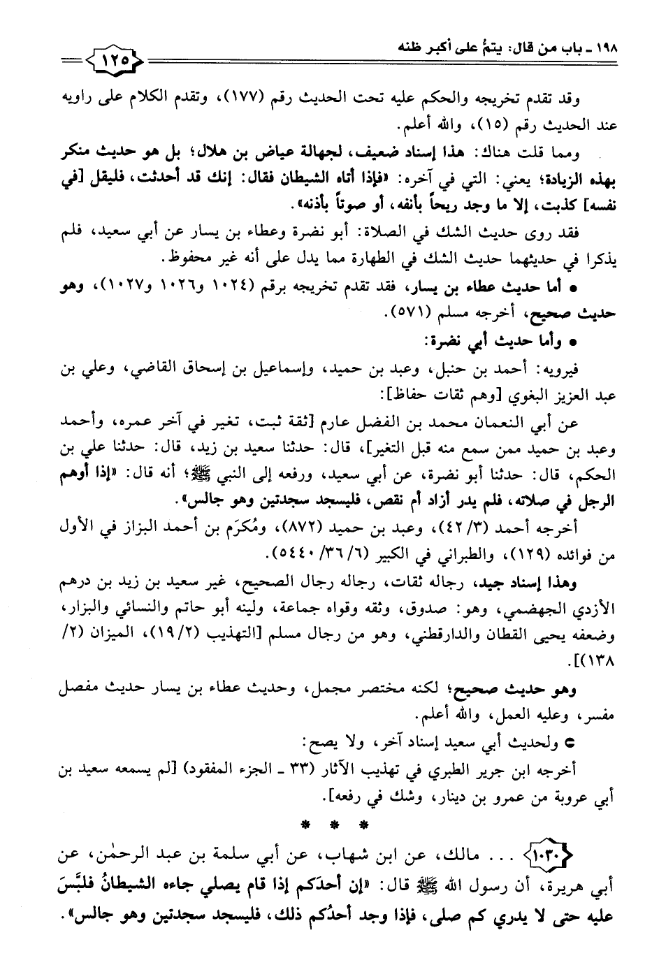١٠٣٠ - . . . مالك، عن ابن شهاب، عن أبي سلمة بن عبد الرحمن، عن أبي هريرة، أن رسول الله - صلى الله عليه وسلم - قال: "إن أحدَكم إذا قام يصلي جاءه الشبطانُ فلبَّسَ عليه حتى لا يدري كم صلى، فإذا وجد أحدُكم ذلك، فليسجد سجدتين وهو جالس".