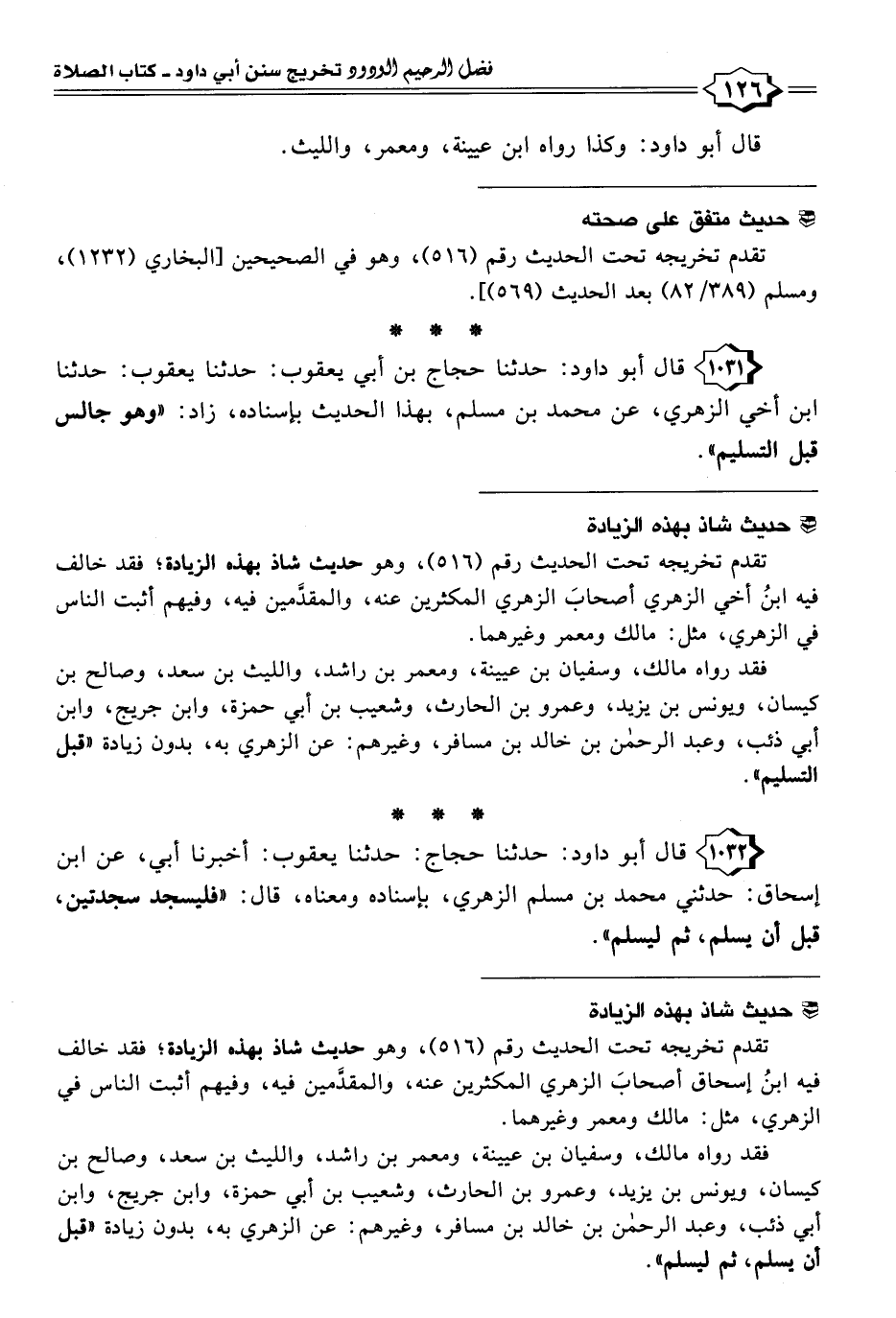 ١٠٣١ - قال أبو داود: حدثنا حجاج بن أبي يعقوب: حدثنا يعقوب: حدثنا ابن أخي الزهري، عن محمد بن مسلم، بهذا الحديث بإسناده، زاد: "وهو جالس قبل التسليم".