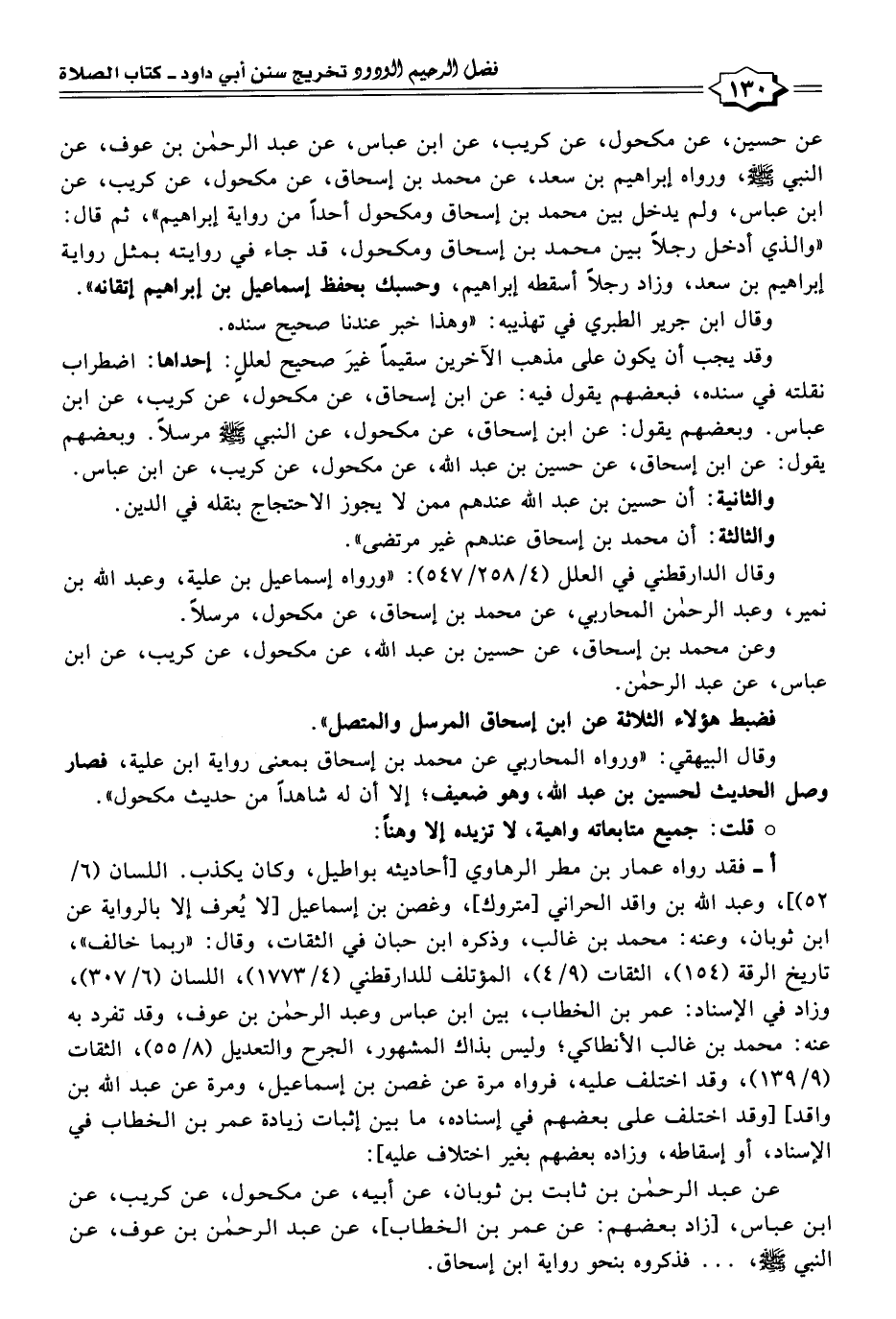 عن حسين، عن مكحول، عن كريب، عن ابن عباس، عن عبد الرحمن بن عوف، عن النبي - صلى الله عليه وسلم -، ورواه إبراهيم بن سعد، عن محمد بن إسحاق، عن مكحول، عن كريب، عن ابن عباس، ولم يدخل بين محمد بن إسحاق ومكحول أحدًا من رواية إبراهيم"، ثم قال: "والذي أدخل رجلًا بين محمد بن إسحاق ومكحول، قد جاء في روايته بمثل رواية إبراهيم بن سعد، وزاد رجلًا أسقطه إبراهيم، وحسبك بحفظ إسماعيل بن إبراهيم إتقانه".