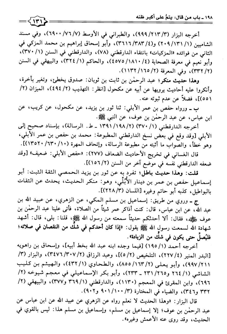 ج - وروي من طريق: إسماعيل بن مسلم المكي، عن الزهري، عن عبيد الله بن عبد الله، عن ابن عباس، قال: كنت أذاكر عمر شيئًا من الصلاة، فأتى علينا عبد الرحمن بن عوف - رضي الله عنه -، فقال: ألا أحدثكم حديثًا سمعته من رسول الله - صلى الله عليه وسلم -، قلنا: بلى، قال: أشهد شهادة الله لسمعت رسول الله - صلى الله عليه وسلم - يقول: "إذا كان أحدكم في شكٍّ من النقصان في صلاته؛ فليُصلِّ حتى يكون في شكٍّ من الزيادة".