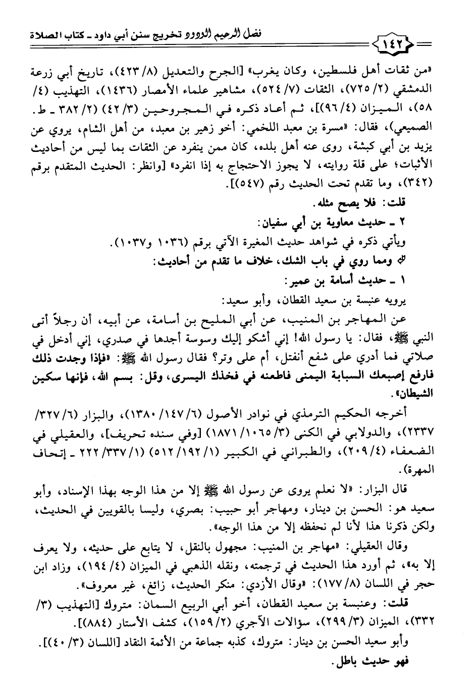 عن المهاجر بن المنيب، عن أبي المليح بن أسامة، عن أبيه، أن رجلًا أتى النبي - صلى الله عليه وسلم -، فقال: يا رسول الله! إني أشكو إليك وسوسة أجدها في صدري، إني أدخل في صلاتي فما أدري على شفع أنفتل، أم على وتر؟ فقال رسول الله - صلى الله عليه وسلم -: "فإذا وجدت ذلك فارفع إصبعك السبابة اليمنى فاطعنه في فخذك اليسرى، وقل: بسم الله، فإنها سكين الشيطان".