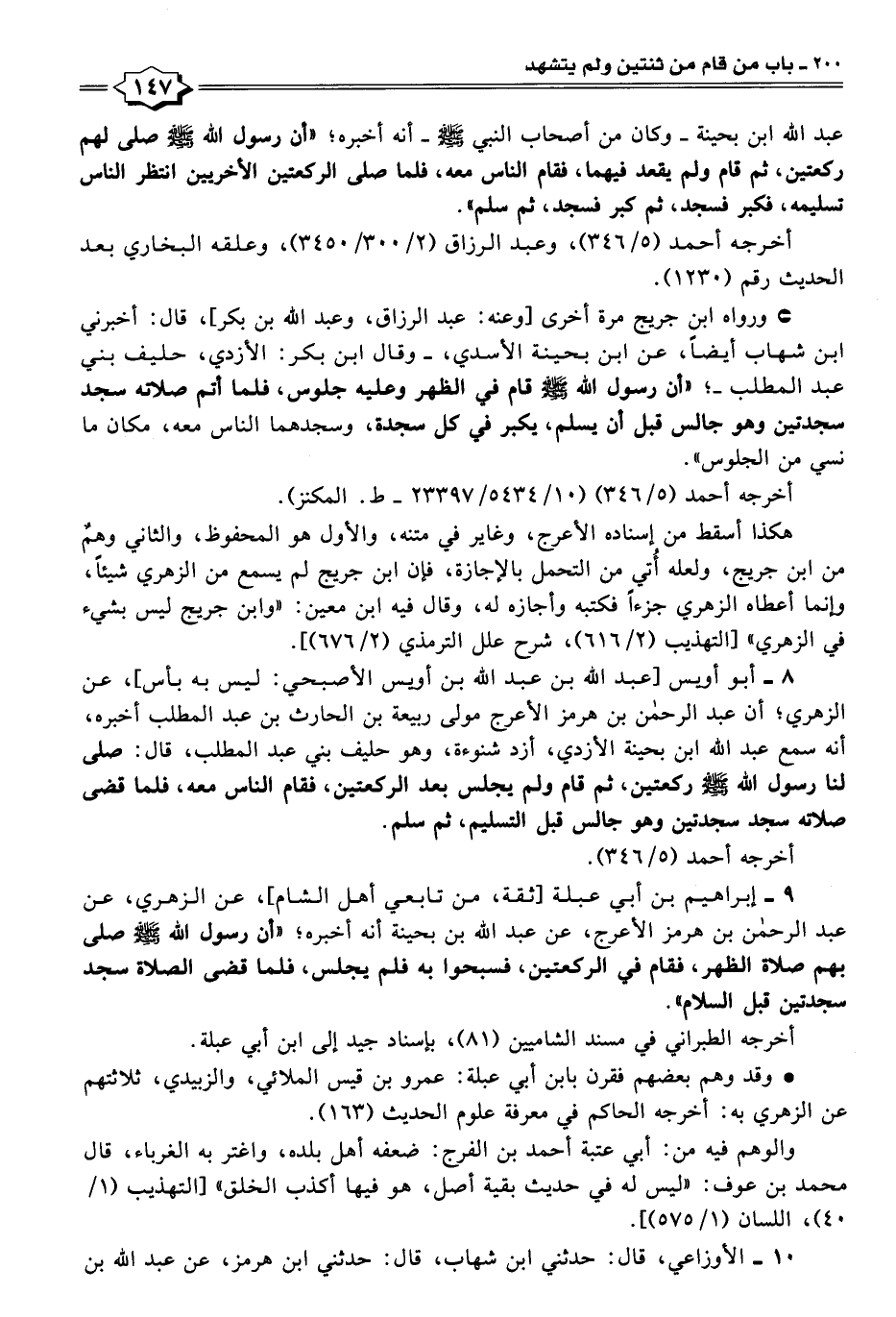 ٩ - إبراهيم بن أبي عبلة [ثقة، من تابعي أهل الشام]، عن الزهري، عن عبد الرحمن بن هرمز الأعرج، عن عبد الله بن بحينة أنه أخبره؛ "أن رسول الله - صلى الله عليه وسلم - صلى بهم صلاة الظهر، فقام في الركعتين، فسبحوا به فلم يجلس، فلما قضى الصلاة سجد سجدتين قبل السلام".