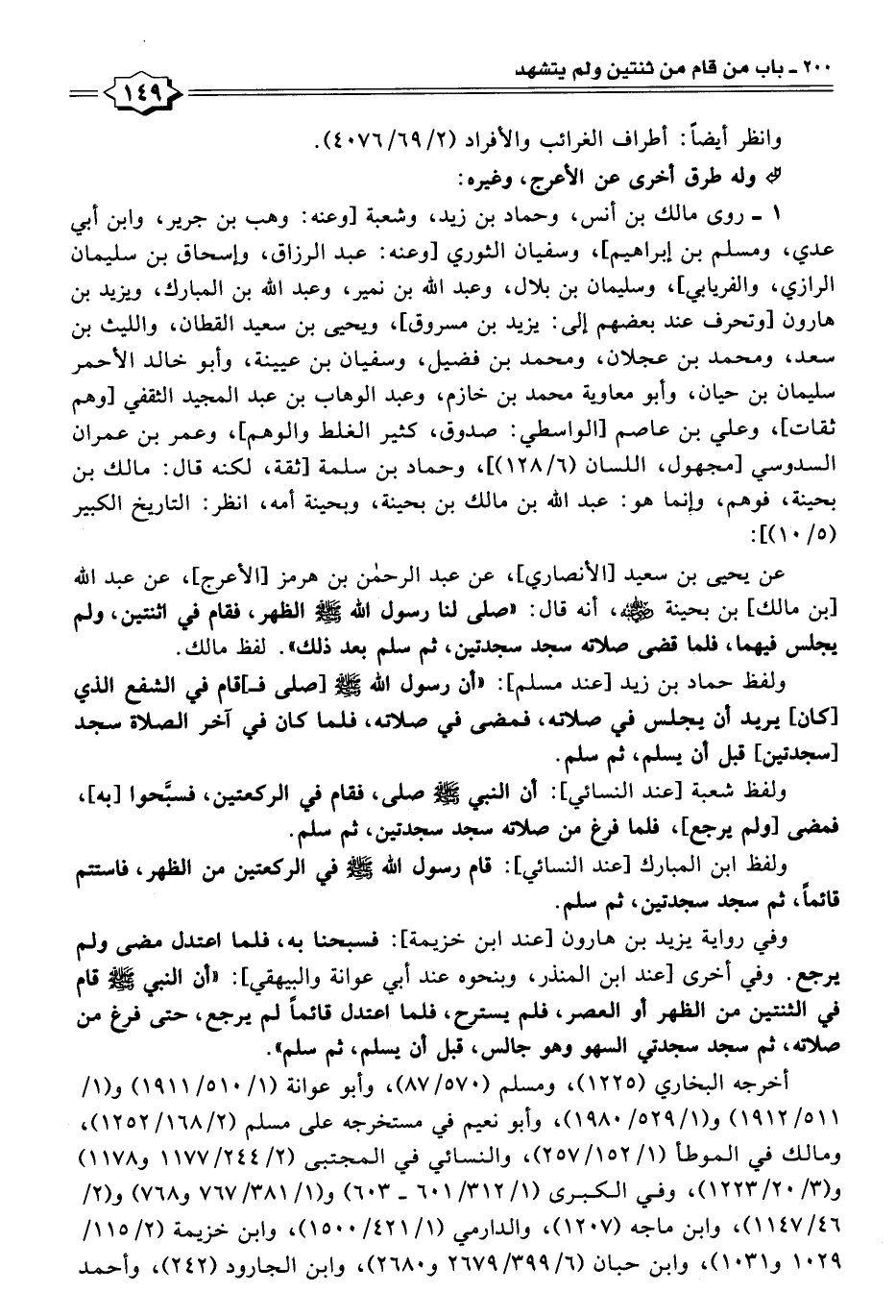 وفي رواية يزيد بن هارون [عند ابن خزيمة]: فسبحنا به، فلما اعتدل مضى ولم يرجع. وفي أخرى [عند ابن المنذر، وبنحوه عند أبي عوانة والبيهقي]: [أن النبي - صلى الله عليه وسلم - قام في الثنتين من الظهر أو العصر، فلم يسترح، فلما اعتدل قائمًا لم يرجع، حتى فرغ من صلاته، ثم سجد سجدتي السهو وهو جالس، قبل أن يسلم، ثم سلم".