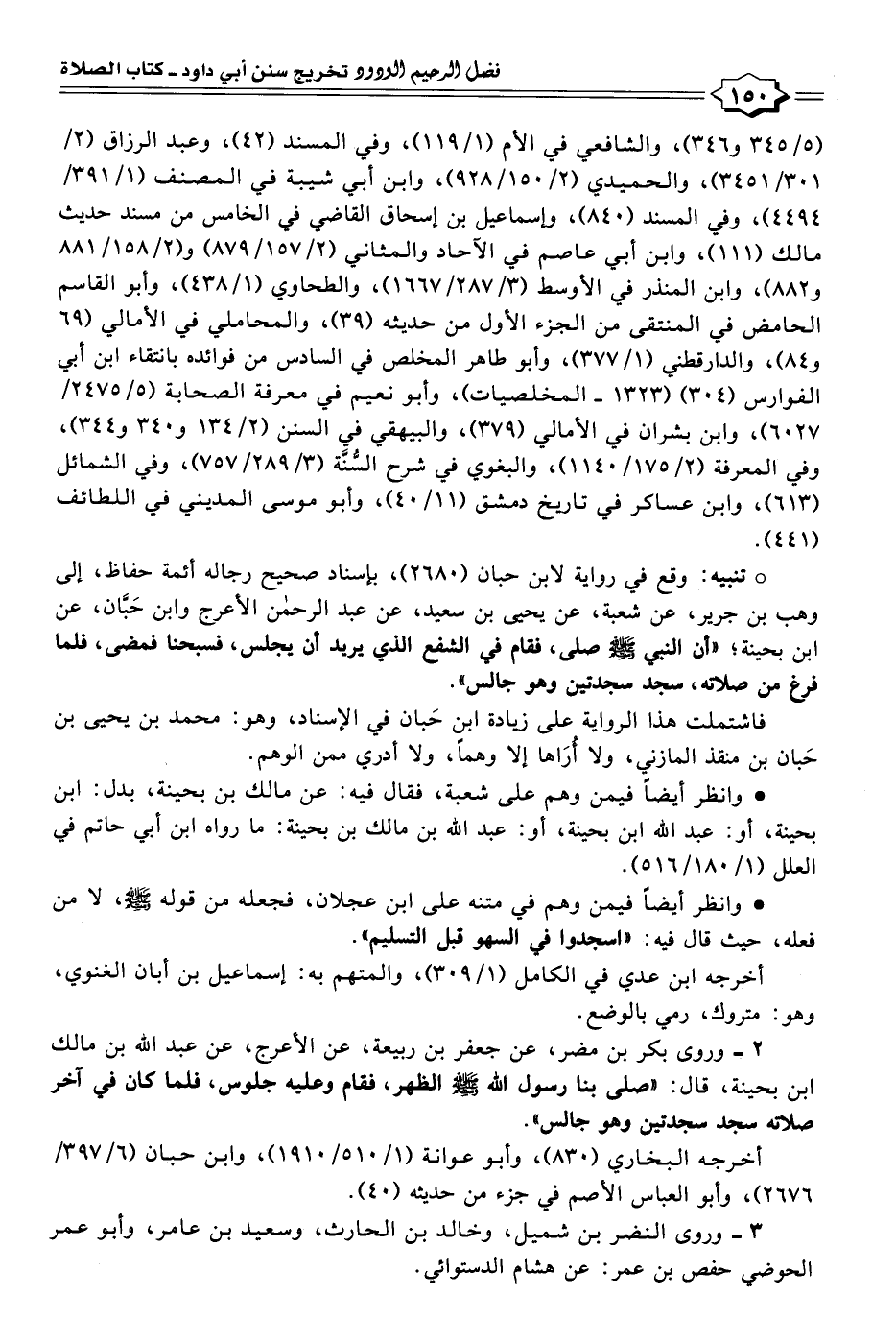 ° تنبيه: وقع في رواية لابن حبان (٢٦٨٠)، بإسناد صحيح رجاله أئمة حفاظ، إلى وهب بن جرير، عن شعبة، عن يحيى بن سعيد، عن عبد الرحمن الأعرج وابن حَبَّان، عن ابن بحينة؛ "أن النبي - صلى الله عليه وسلم - صلى، فقام في الشفع الذي يريد أن يجلس، فسبحنا فمضى، فلما فرغ من صلاته، سجد سجدتين وهو جالس".