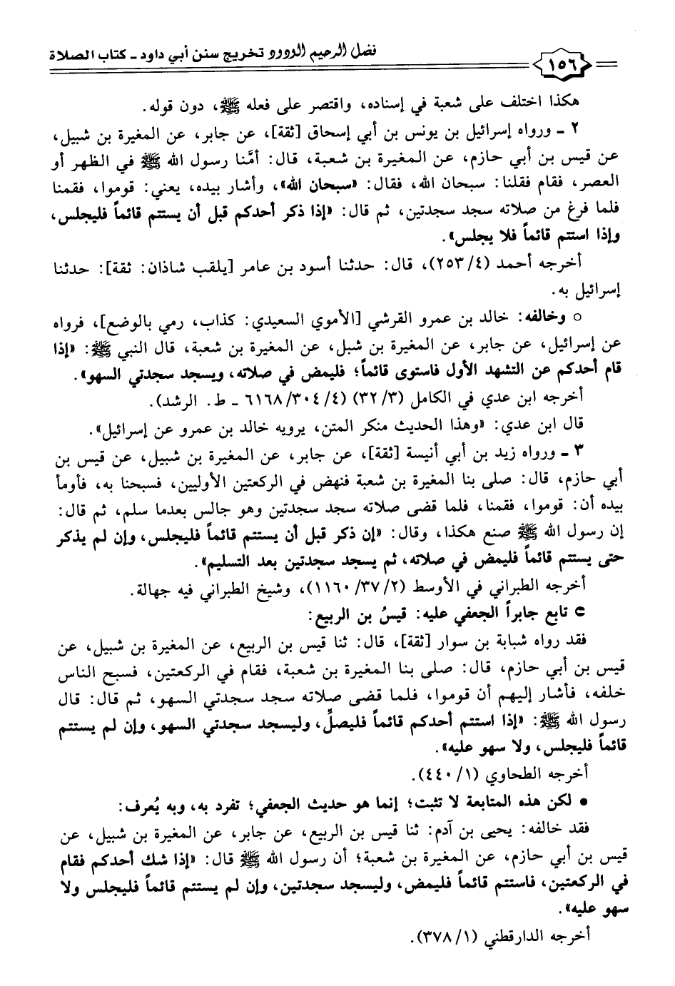 ° وخالفه: خالد بن عمرو القرشي [الأموي السعيدي: كذاب، رمي بالوضع]، فرواه عن إسرائيل، عن جابر، عن المغيرة بن شبل، عن المغيرة بن شعبة، قال النبي - صلى الله عليه وسلم -: "إذا قام أحدكم عن التشهد الأول فاستوى قائمًا؛ فليمض في صلاته، ويسجد سجدتي السهو".