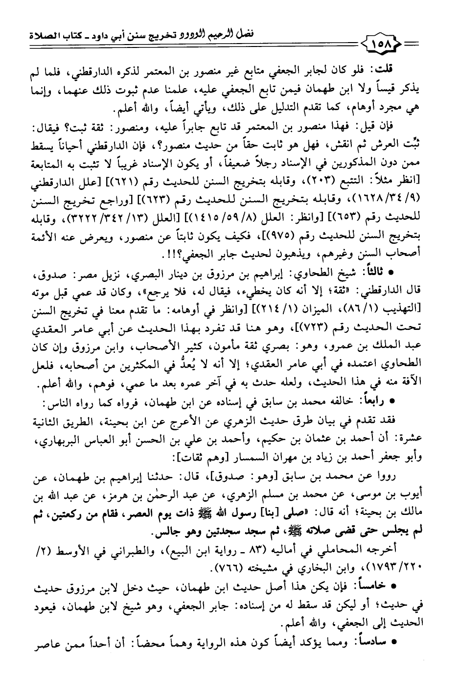 وإن قيل: فهذا منصور بن المعتمر قد تابع جابرًا عليه، ومنصور: ثقة ثبت؟ فيقال: ثبِّت العرش ثم انقش، فهل هو ثابت حقًا من حديث منصور؟، فإن الدارقطني أحيانًا يسقط ممن دون المذكورين في الإسناد رجلًا ضعيفًا، أو يكون الإسناد غريبًا لا تثبت به المتابعة [انظر مثلًا: التتبع (٢٠٣)، وقابله بتخريج السنن للحديث رقم (٦٢١)] [علل الدارقطني (٩/ ٣٤/ ١٦٢٨)، وقابله بتخريج السنن للحديث رقم (٦٢٣)، [وراجع تخريج السنن للحديث رقم (٦٥٣)] [وانظر: العلل (٨/ ٥٩/ ١٤١٥)، [العلل (١٣/ ٣٤٢/ ٣٢٢٢)، وقابله بتخريج السنن للحديث رقم (٩٧٥)]، فكيف يكون ثابتًا عن منصور، ويعرض عنه الأئمة أصحاب السنن وغيرهم، ويذهبون لحديث جابر الجعفي؟!!.