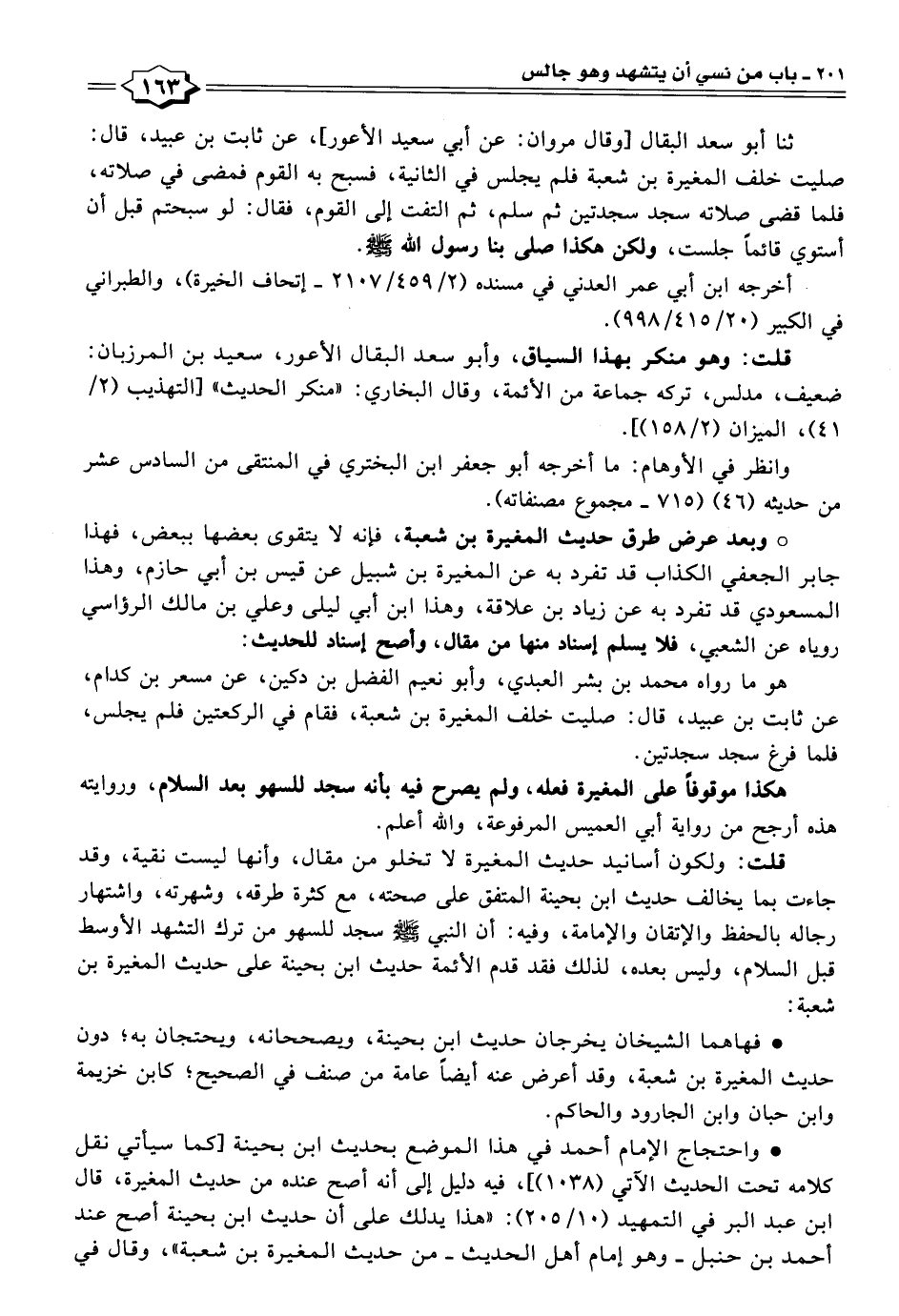 قلت: ولكون أسانيد حديث المغيرة لا تخلو من مقال، وأنها ليست نقية، وقد جاءت بما يخالف حديث ابن بحينة المتفق على صحته، مع كثرة طرقه، وشهرته، واشتهار رجاله بالحفظ والإتقان والإمامة، وفيه: أن النبي - صلى الله عليه وسلم - سجد للسهو من ترك التشهد الأوسط قبل السلام، وليس بعده، لذلك فقد قدم الأئمة حديث ابن بحينة على حديث المغيرة بن شعبة: