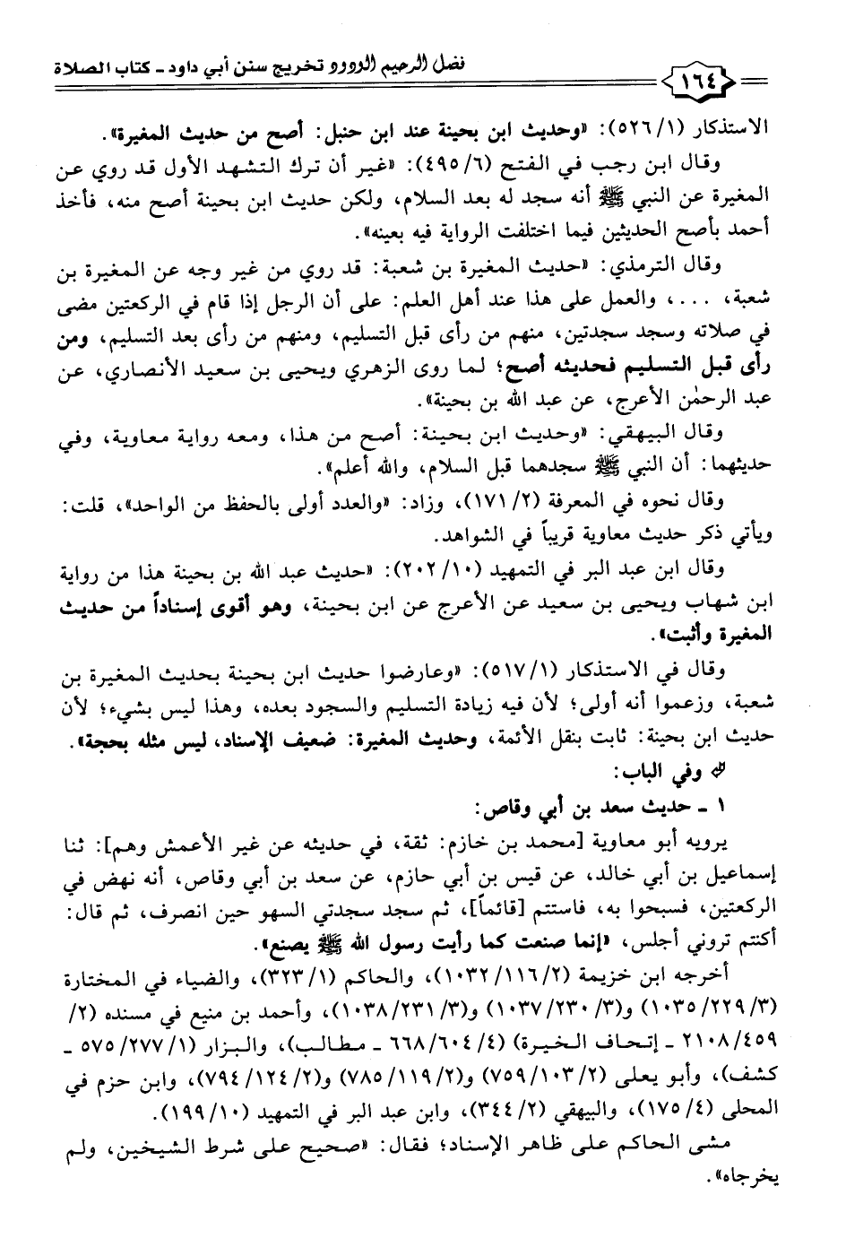 وقال في الاستذكار (١/ ٥١٧): "وعارضوا حديث ابن بحينة بحديث المغيرة بن شعبة، وزعموا أنه أولى؛ لأن فيه زيادة التسليم والسجود بعده، وهذا ليس بشيء؛ لأن حديث ابن بحينة: ثابت بنقل الأئمة، وحديث المنيرة: ضعيف الإسناد، ليس مثله بحجة".