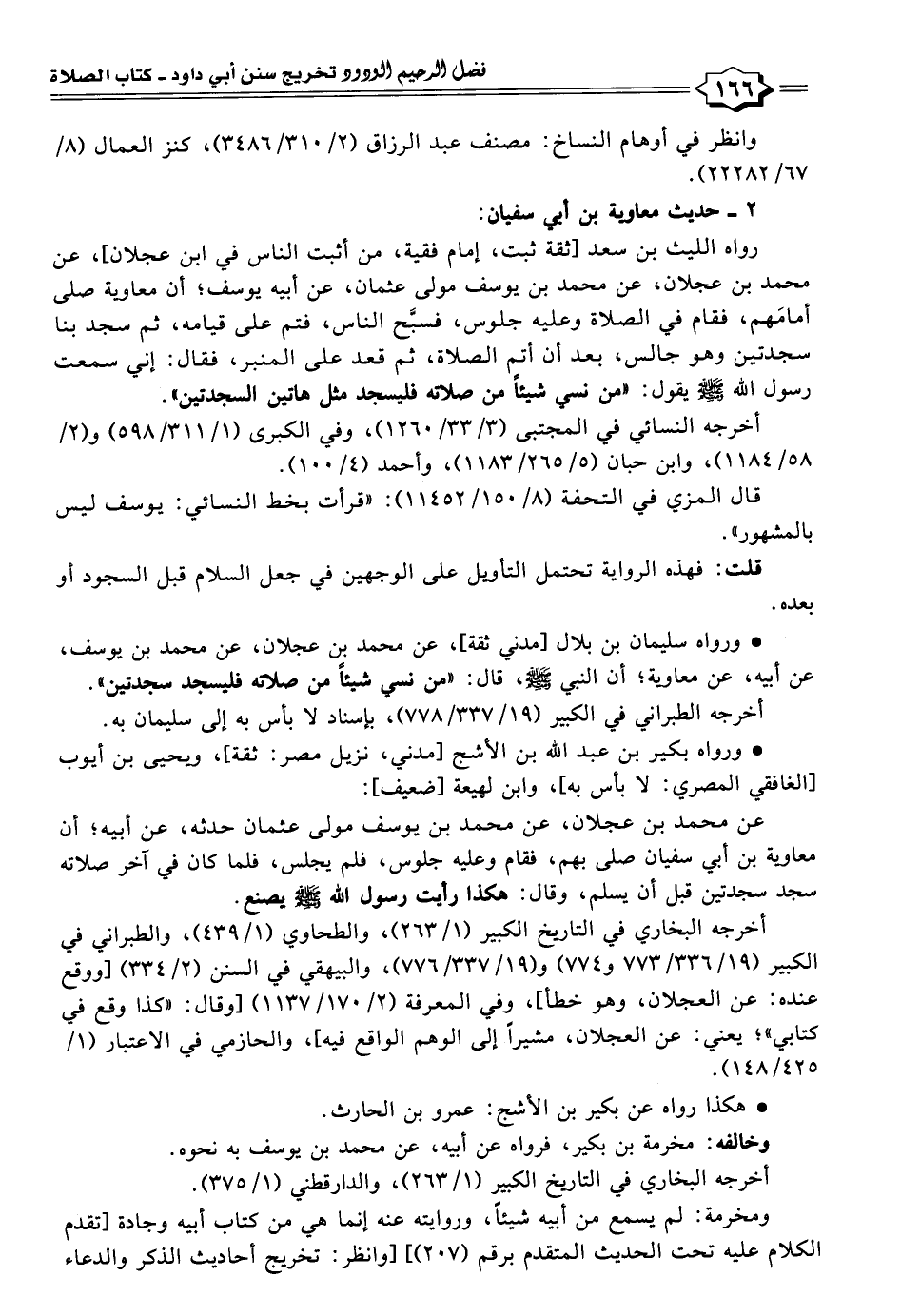 رواه الليث بن سعد [ثقة ثبت، إمام فقيه، من أثبت الناس في ابن عجلان]، عن محمد بن عجلان، عن محمد بن يوسف مولى عثمان، عن أبيه يوسف؛ أن معاوية صلى أمامَهم، فقام في الصلاة وعليه جلوس، فسبَّح الناس، فتم على قيامه، ثم سجد بنا سجدتين وهو جالس، بعد أن أتم الصلاة، ثم قعد على المنبر، فقال: إني سمعت رسول اللّه - صلى الله عليه وسلم - يقول: "من نسي شيئًا من صلاته فليسجد مثل هاتين السجدتين".