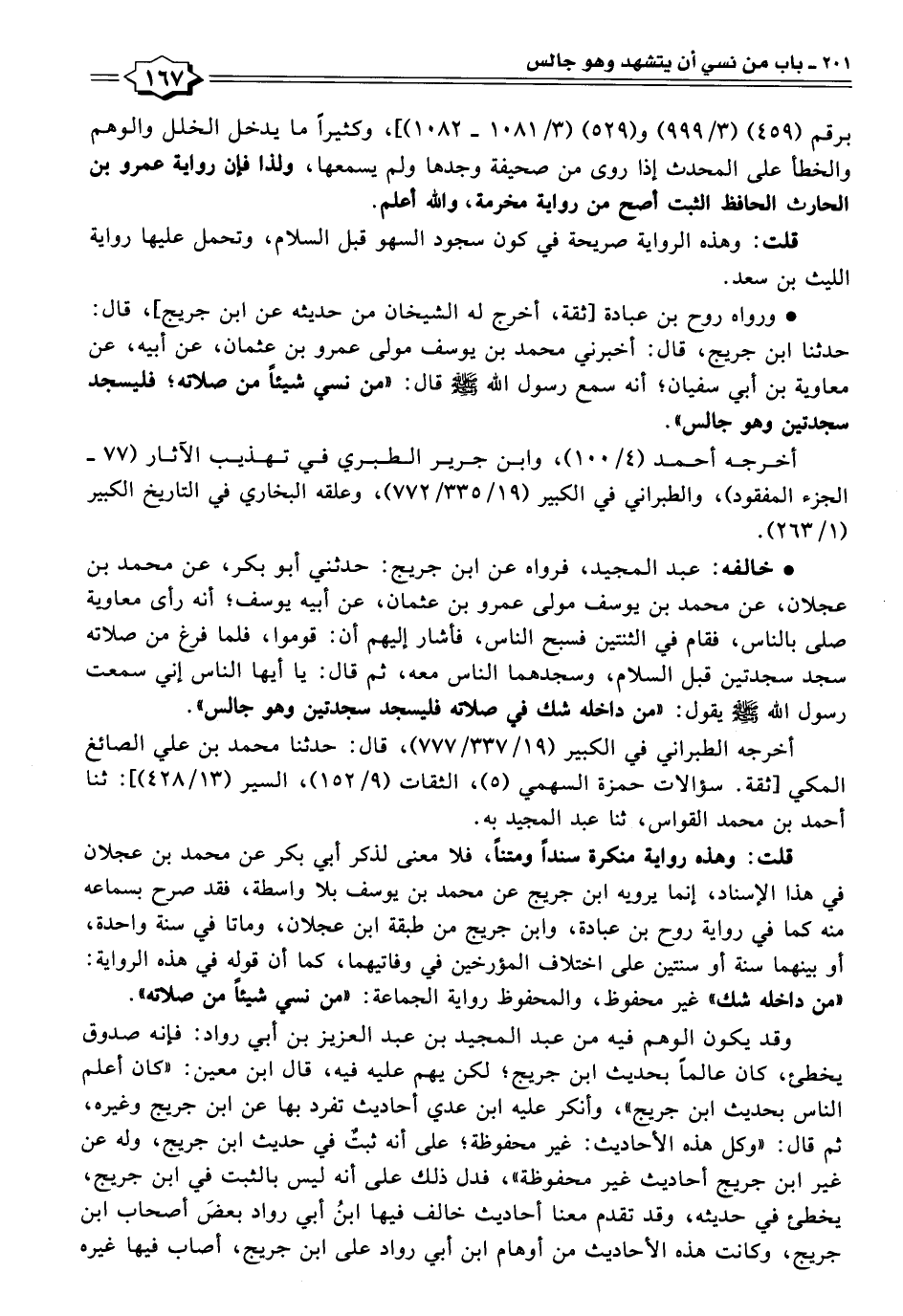 قلت: وهذه رواية منكرة سندًا ومتنًا، فلا معنى لذكر أبي بكر عن محمد بن عجلان في هذا الإسناد، إنما يرويه ابن جريج عن محمد بن يوسف بلا واسطة، فقد صرح بسماعه منه كما في رواية روح بن عبادة، وابن جريج من طبقة ابن عجلان، وماتا في سنة واحدة، أو بينهما سنة أو سنتين على اختلاف المؤرخين في وفاتيهما، كما أن قوله في هذه الرواية: "من داخله شك" غير محفوظ، والمحفوظ رواية الجماعة: "من نسي شيئًا من صلاته".