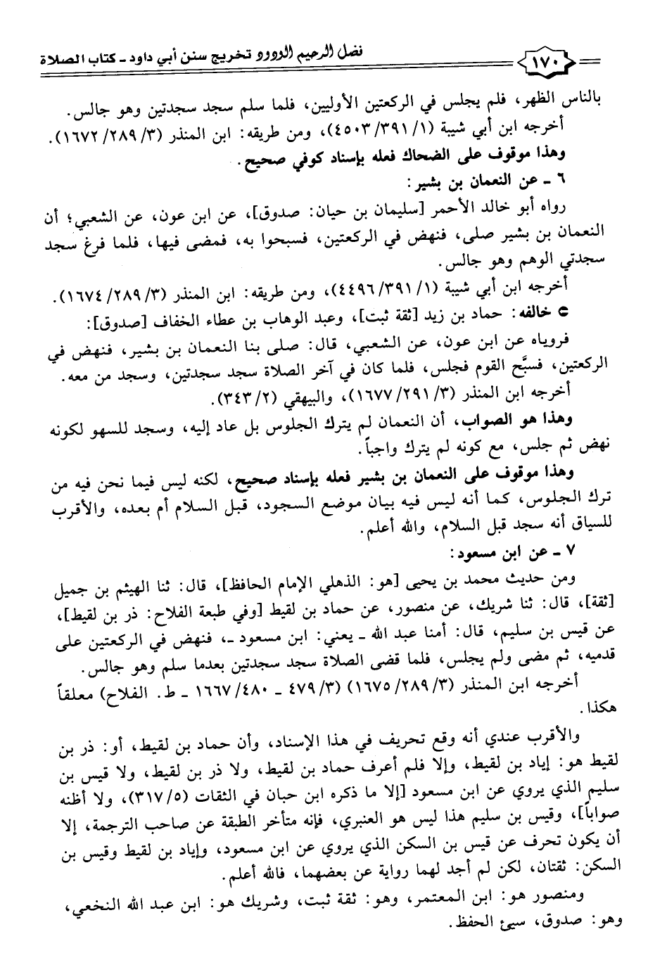 وهذا موقوف على النعمان بن بشير فعله بإسناد صحيح، لكنه ليس فيما نحن فيه من ترك الجلوس، كما أنه ليس فيه بيان موضع السجود، قبل السلام أم بعده، والأقرب للسياق أنه سجد قبل السلام، والله أعلم.