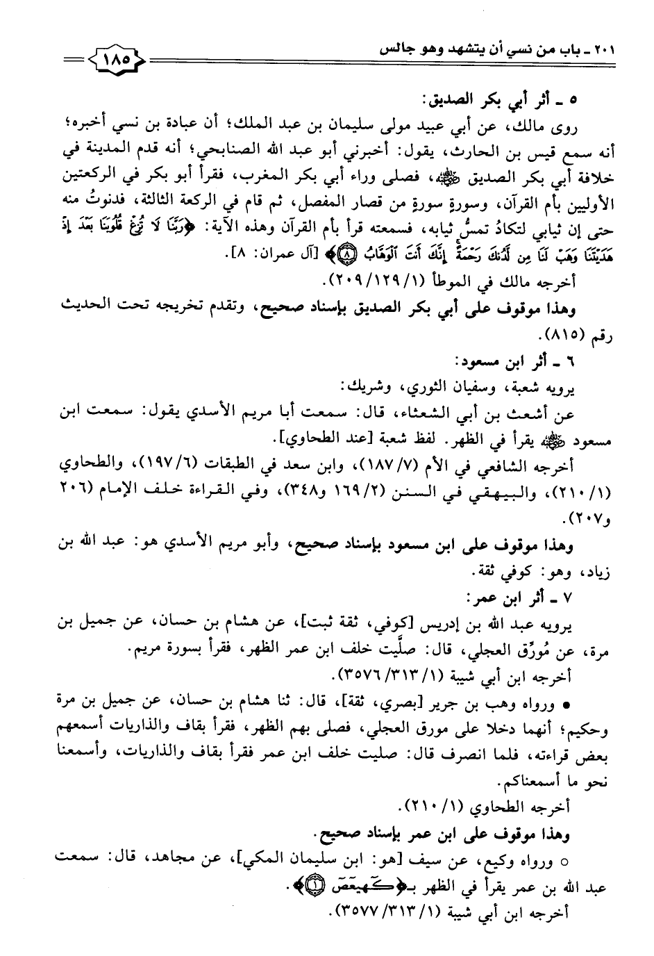 روى مالك، عن أبي عبيد مولى سليمان بن عبد الملك؛ أن عبادة بن نسي أخبره؛ أنه سمع قيس بن الحارث، يقول: أخبرني أبو عبد الله الصنابحي؛ أنه قدم المدينة في خلافة أبي بكر الصديق - رضي الله عنه -، فصلى وراء أبي بكر المغرب، فقرأ أبو بكر في الركعتين الأوليين بأم القرآن، وسورةٍ سورةٍ من قصار المفصل، ثم قام في الركعة الثالثة، فدنوتُ منه حتى إن ثيابي لتكادُ تمسُّ ثيابه، فسمعته قرأ بأم القرآن وهذه الآية: {رَبَّنَا لَا تُزِغْ قُلُوبَنَا بَعْدَ إِذْ هَدَيْتَنَا وَهَبْ لَنَا مِنْ لَدُنْكَ رَحْمَةً إِنَّكَ أَنْتَ الْوَهَّابُ (٨)} [آل عمران: ٨].