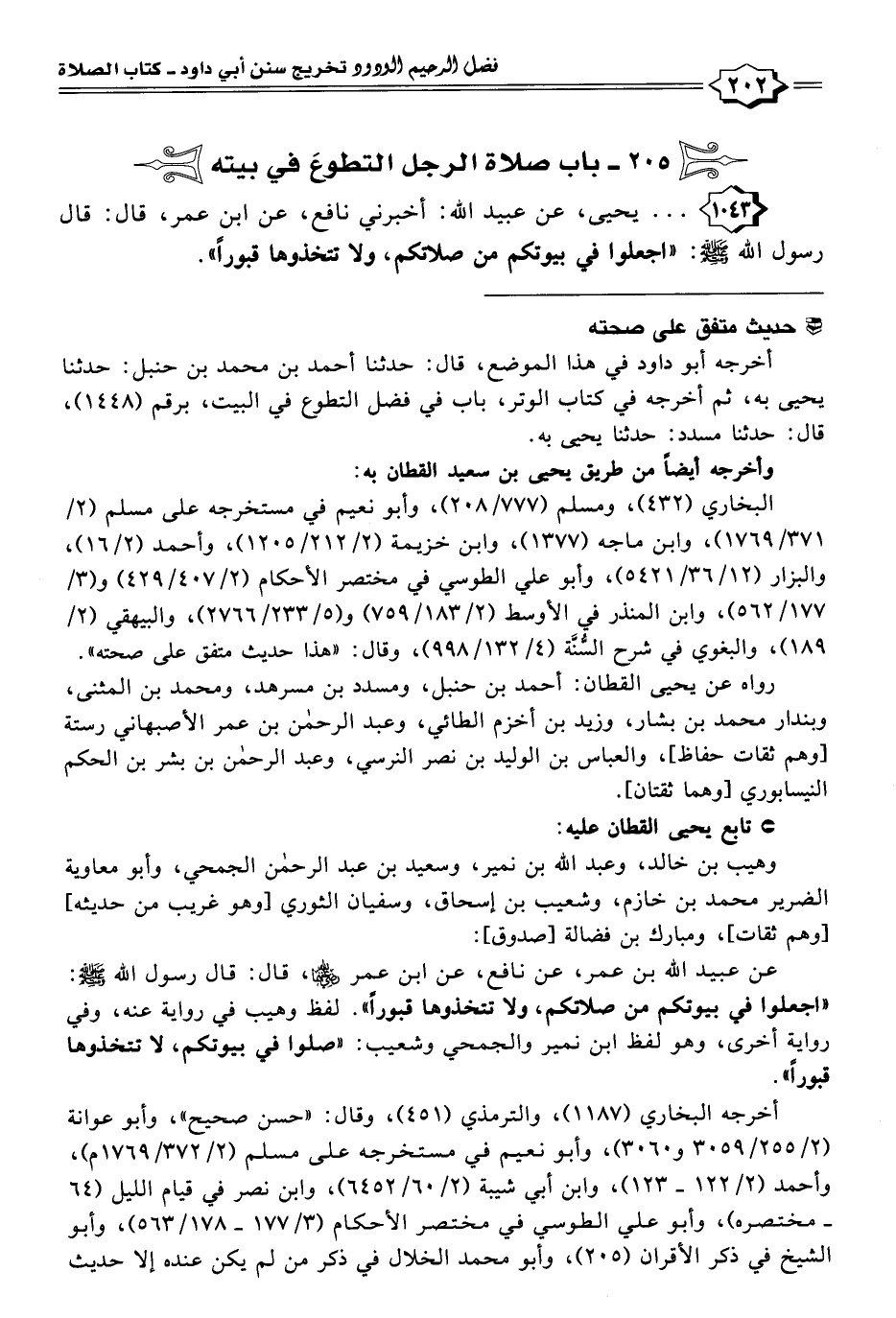 أخرجه أبو داود في هذا الموضع، قال: حدثنا أحمد بن محمد بن حنبل: حدثنا يحيى به، ثم أخرجه في كتاب الوتر، باب في فضل التطوع في البيت، برقم (١٤٤٨)، قال: حدثنا مسدد: حدثنا يحيى به.