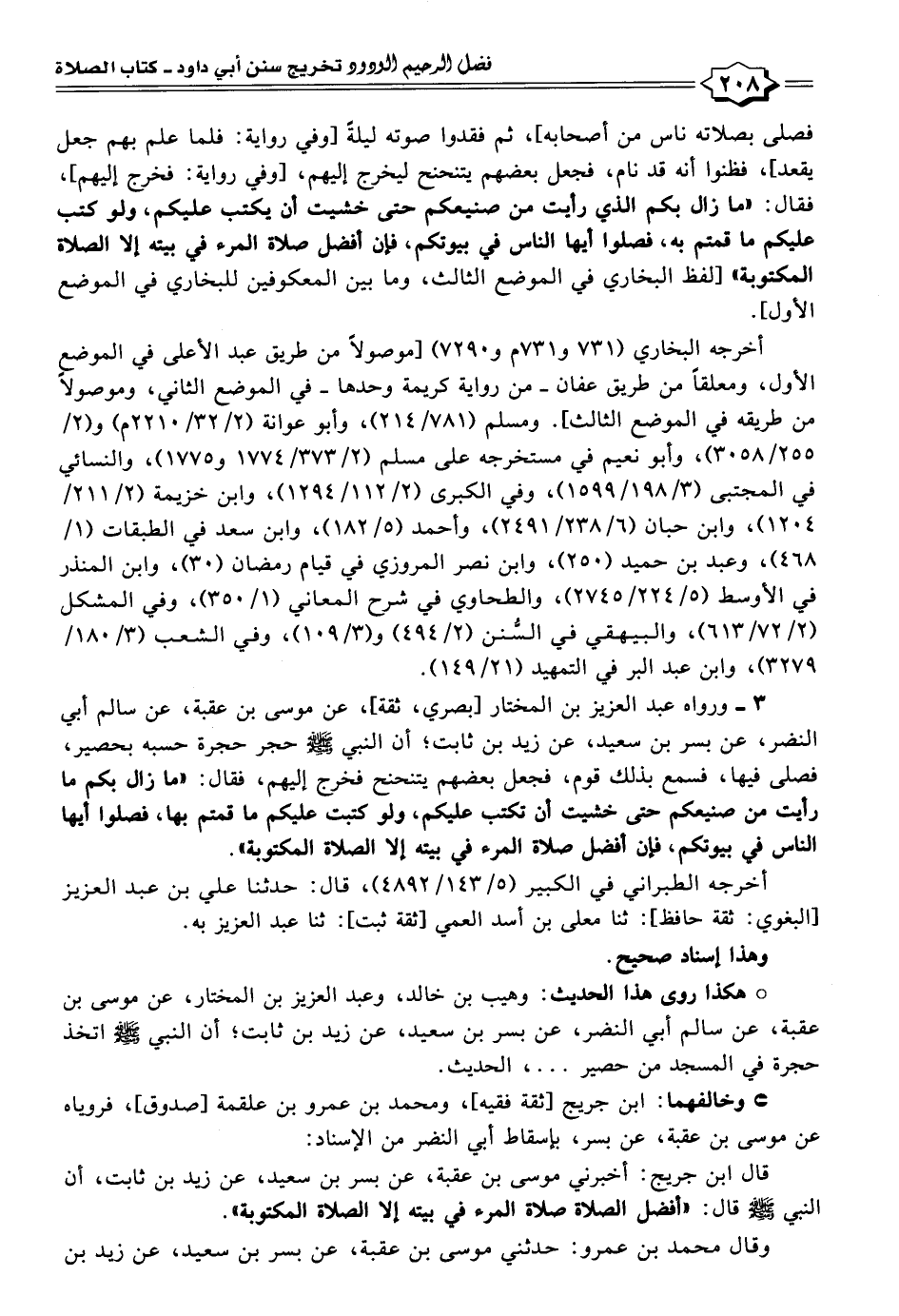 قال ابن جريج: أخبرني موسى بن عقبة، عن بسر بن سعيد، عن زيد بن ثابت، أن النبي - صلى الله عليه وسلم - قال: "أفضل الصلاة صلاة المرء في بيته إلا الصلاة المكتوبة".
