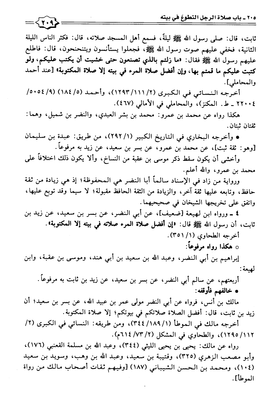 ثابت، قال: صلى رسول الله - صلى الله عليه وسلم - ليلةً، فسمع أهل المسجد صلاته، قال: فكثر الناس الليلة الثانية، فخفي عليهم صوت رسول الله - صلى الله عليه وسلم -، فجعلوا يستأنسون ويتنحنحون، قال: فاطلع عليهم رسول الله - صلى الله عليه وسلم - فقال: "ما زلتم بالذي تصنعون حتى خشيت أن يكتب عليكم، ولو كتبت عليكم ما قمتم بها، وإن أفضل صلاة المرء في بيته إلا صلاة المكتوبة" [عند أحمد والمحاملي].