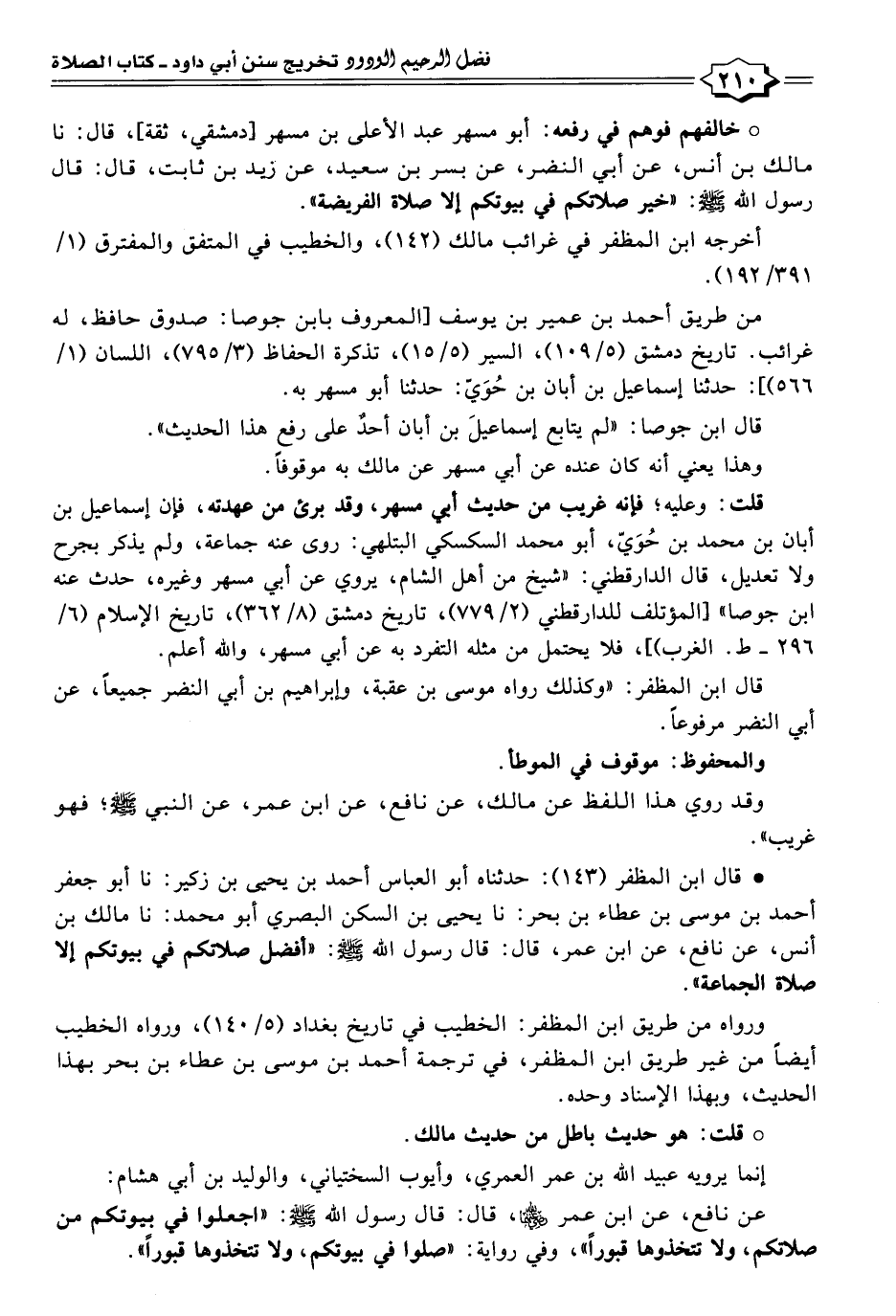 ° خالفهم فوهم في رفعه: أبو مسهر عبد الأعلى بن مسهر [دمشقي، ثقة]، قال: نا مالك بن أنس، عن أبي النضر، عن بسر بن سعيد، عن زيد بن ثابت، قال: قال رسول الله - صلى الله عليه وسلم -: "خير صلاتكم في بيوتكم إلا صلاة الفريضة".