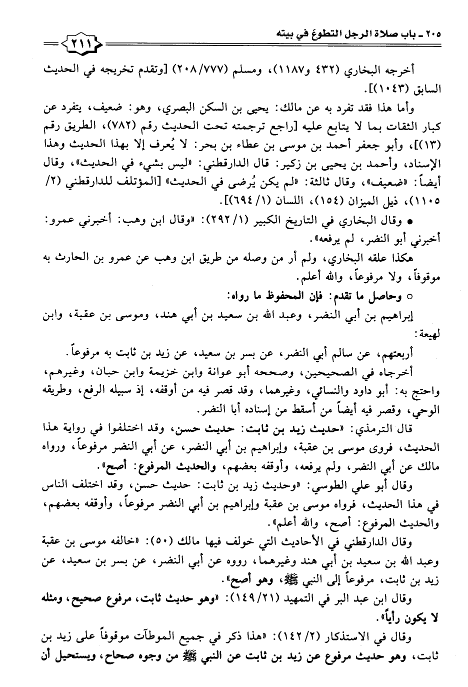 وقال الدارقطني في الأحاديث التي خولف فيها مالك (٥٠): "خالفه موسى بن عقبة وعبد الله بن سعيد بن أبي هند وغيرهما، رووه عن أبي النضر، عن بسر بن سعيد، عن زيد بن ثابت، مرفوعًا إلى النبي - صلى الله عليه وسلم -، وهو أصح".