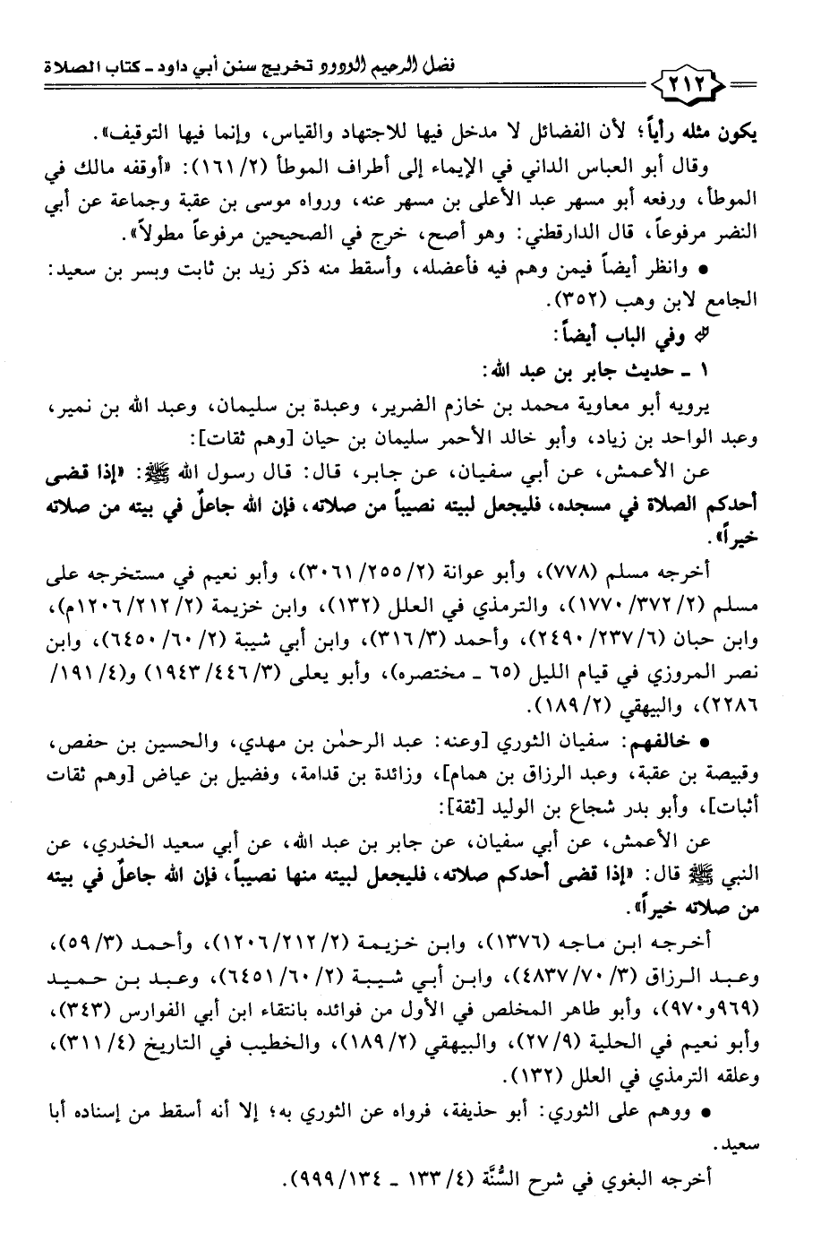 عن الأعمش، عن أبي سفيان، عن جابر، قال: قال رسول الله - صلى الله عليه وسلم -: "إذا قضى أحدكم الصلاة في مسجده، فليجعل لبيته نصيبًا من صلاته، فإن الله جاعلٌ في بيته من صلاته خيرًا".