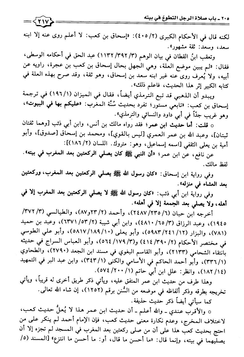 ° والأقرب عندي - والله أعلم - أن حديث ابن عمر هذا لا يُعلُّ حديث كعب، لاختلاف المخرج، وعدم نكارة معنى حديث كعب، فإن الإمام أحمد لم ينكر على من احتج بحديث كعب هذا على أن من صلى ركعتين بعد المغرب في المسجد لم تجزه إلا أن يصليهما في بيته، وإنما قال: "ما أحسن ما قال، أو: ما أحسن ما انتزع" [المسند (٥/