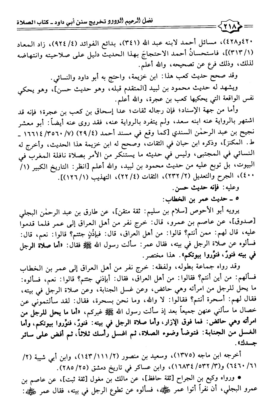 يرويه أبو الأحوص [سلام بن سليم: ثقة متقن]، عن طارق بن عبد الرحمن البجلي [صدوق]، عن عاصم بن عمرو، قال: خرج نفر من أهل العراق إلى عمر فلما قدموا عليه، قال لهم: ممن أنتم؟ قالوا: من أهل العراق، قال: فبإذْنٍ جئتم؟ قالوا: نعم، قال: فسألوه عن صلاة الرجل في بيته، فقال عمر: سألت رسول الله - صلى الله عليه وسلم - فقال: "أما صلاة الرجل في بيته فنورٌ، فنوِّروا بيوتكم". هذا مختصر.