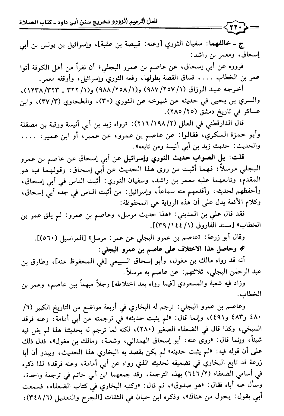 قلت: بل الصواب حديث الثوري وإسرائيل عن أبي إسحاق عن عاصم بن عمرو البجلي مرسلًا؛ فهما أثبت من روى هذا الحديث عن أبي إسحاق، وقولهما فيه هو المقدم، وتابعهما عليه معمر بن راشد، وسفيان الثوري: أثبت الناس في أبي إسحاق، وأحفظهم لحديثه، وأقدمهم منه سماعًا، وإسرائيل: من أثبت الناس في جده أبي إسحاق، وكلام الأئمة يدل على أن هذه الرواية هي المحفوظة:
