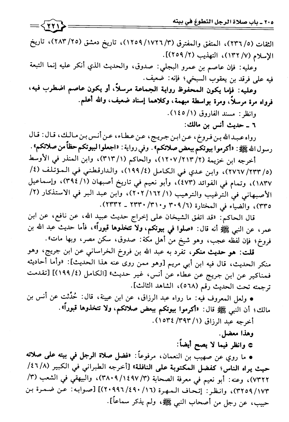 • ولعل المعروف فيه: ما رواه عبد الرزاق، عن ابن عيينة، قال: حُدِّثت عن أنس بن مالك؛ أن النبي - صلى الله عليه وسلم - قال: "أكرموا بيوتكم ببعض صلاتكم، ولا تتخذوها قبورًا".