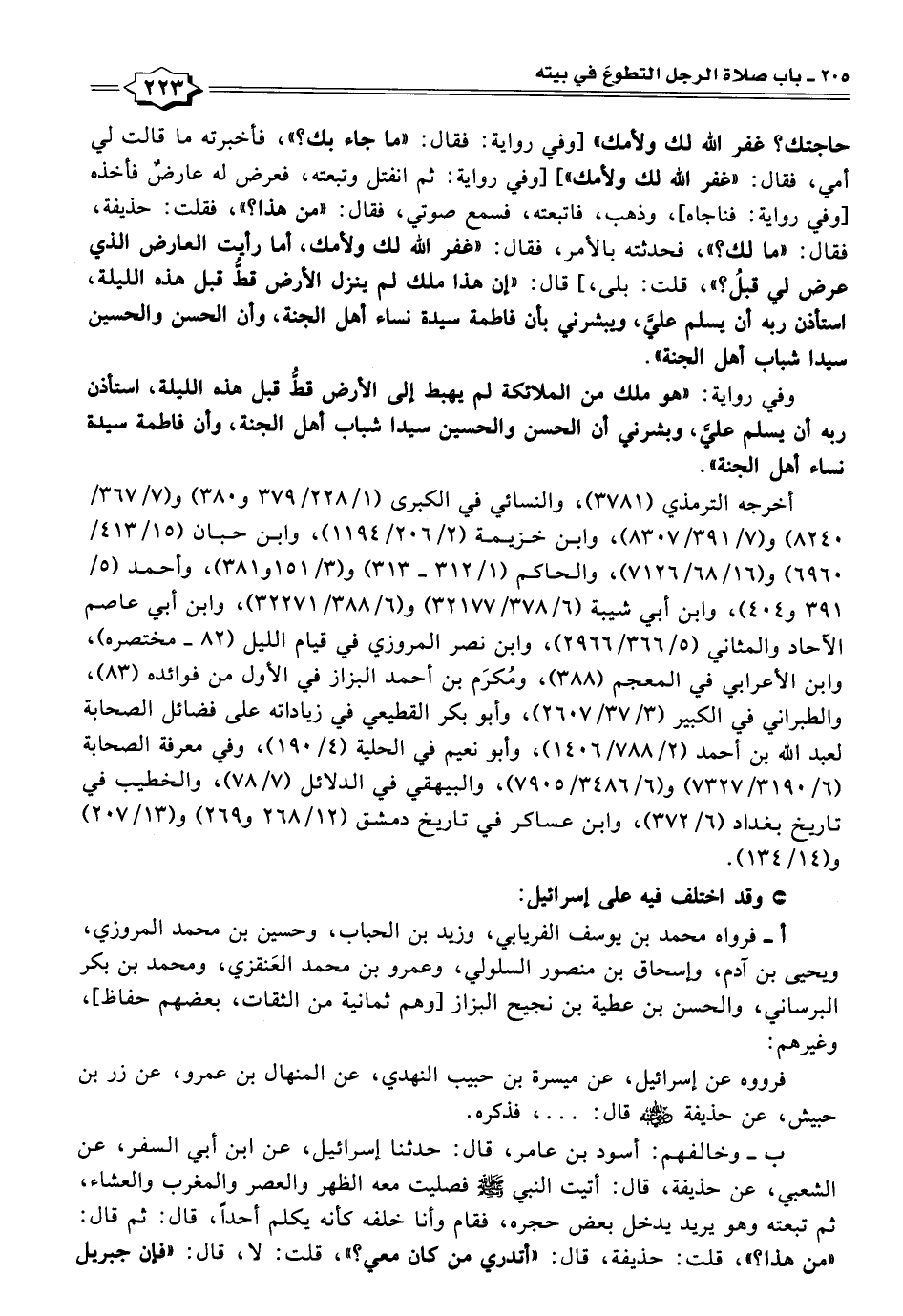 ب - وخالفهم: أسود بن عامر، قال: حدثنا إسرائيل، عن ابن أبي السفر، عن الشعبي، عن حذيفة، قال: أتيت النبي - صلى الله عليه وسلم - فصليت معه الظهر والعصر والمغرب والعشاء، ثم تبعته وهو يريد يدخل بعض حجره، فقام وأنا خلفه كأنه يكلم أحدًا، قال: ثم قال: "من هذا؟ "، قلت: حذيفة، قال: "أتدري من كان معي؟ "، قلت: لا، قال: "فإن جبريل