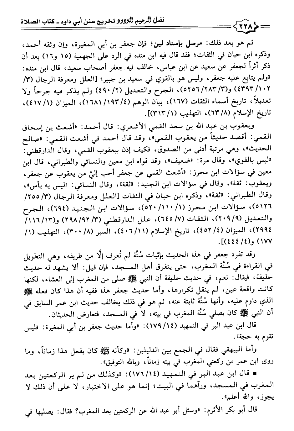 وقد تفرد جعفر في هذا الحديث بإثبات سُنَّة لم تُعرف إلَّا من طريقه، وهي التطويل في القراءة في سُنَّة المغرب، حتى يتفرق أهل المسجد، فإن قيل: ألا يشهد له حديث حذيفة، فيقال: نعم، في حديث حذيفة أن النبي - صلى الله عليه وسلم - صلى من المغرب إلى العشاء، لكنها كانت واقعة عين، لم ينقل تكرارها، وأما حديث جعفر هذا ففيه أن هذا كان فعله - صلى الله عليه وسلم - الذي داوم عليه، وأنها سُنَّة ثابتة عنه، ثم هو في ذلك يخالف حديث ابن عمر السابق في أن النبي - صلى الله عليه وسلم - كان يصلي سُنَّة المغرب في بيته، لا في المسجد، فتعارض الحديثان.