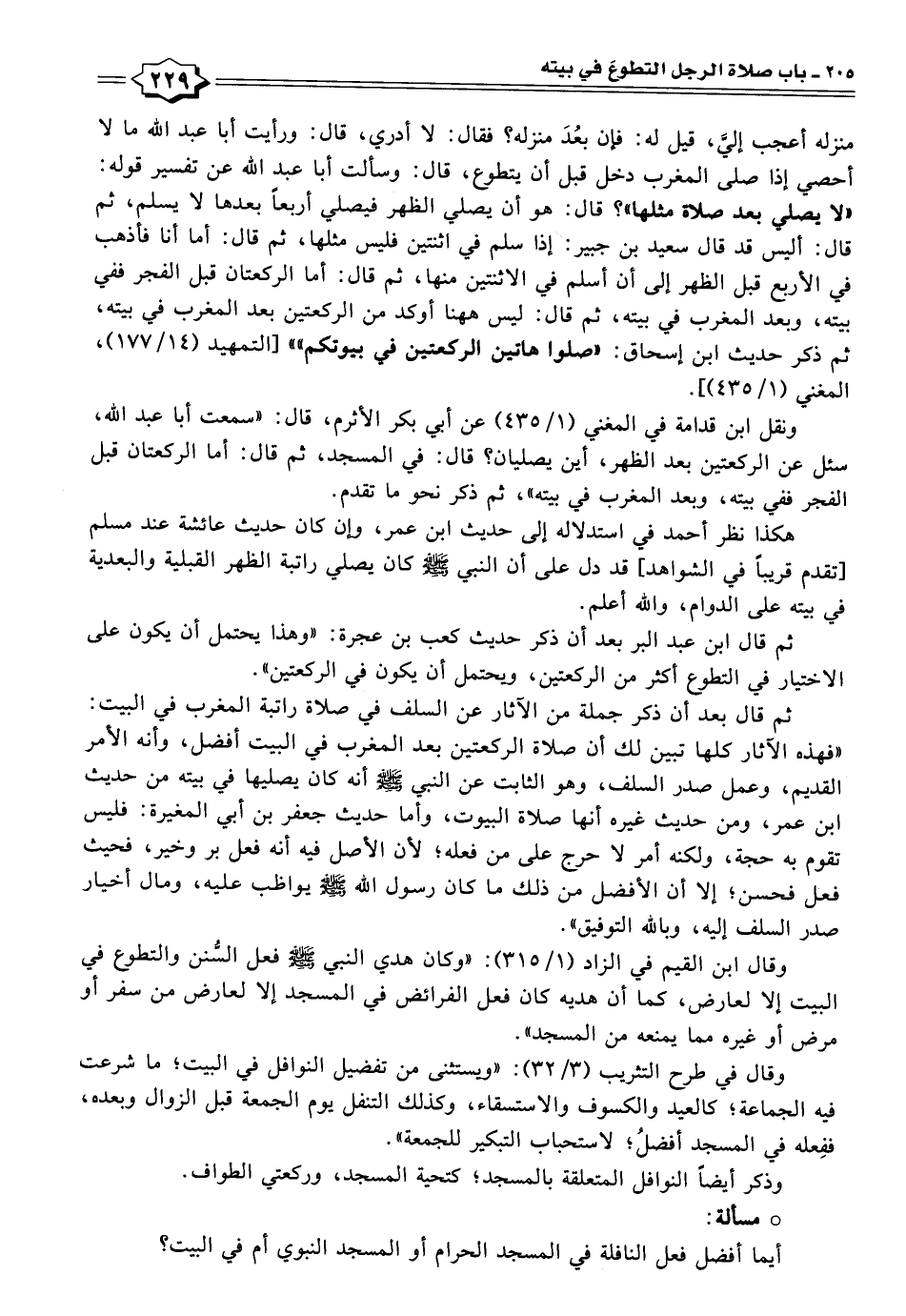 وقال ابن القيم في الزاد (١/ ٣١٥): "وكان هدي النبي - صلى الله عليه وسلم - فعل السُّنن والتطوع في البيت إلا لعارض، كما أن هديه كان فعل الفرائض في المسجد إلا لعارض من سفر أو مرض أو غيره مما يمنعه من المسجد".