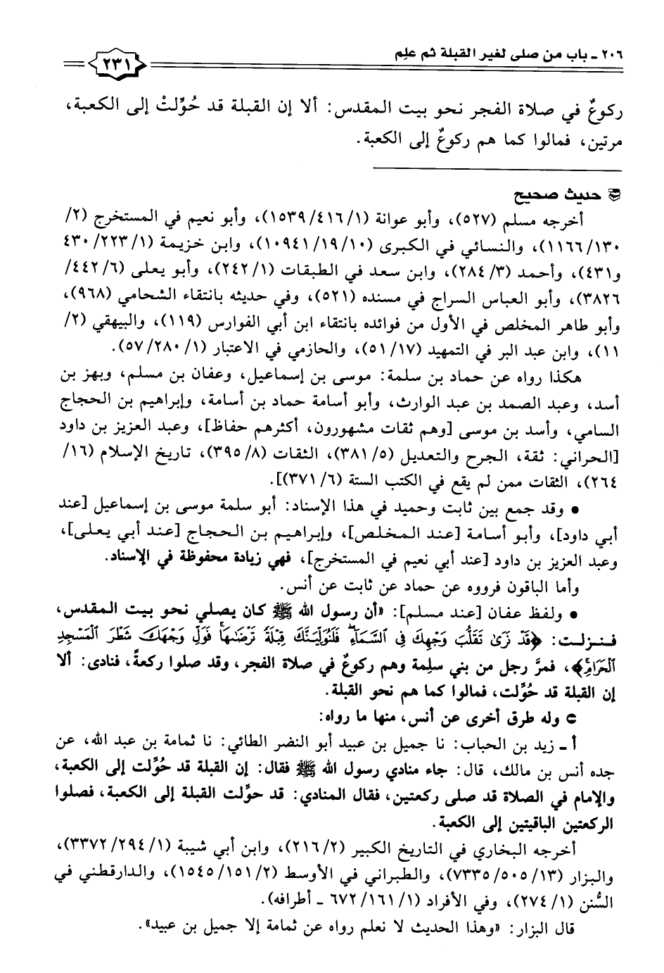 أ - زيد بن الحباب: نا جميل بن عبيد أبو النضر الطائي: نا ثمامة بن عبد الله، عن جده أنس بن مالك، قال: جاء منادي رسول الله - صلى الله عليه وسلم - فقال: إن القبلة قد حُوِّلت إلى الكعبة، والإمام في الصلاة قد صلى ركعتين، فقال المنادي: قد حوِّلت القبلة إلى الكعبة، فصلوا الركعتين الباقيتين إلى الكعبة.