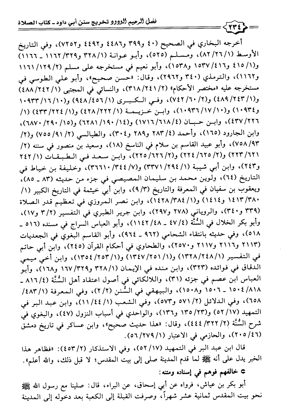 أخرجه البخاري في الصحيح (٤٠ و ٣٩٩ و ٤٤٨٦ و ٤٤٩٢ و ٧٢٥٢)، وفي التاريخ الأوسط (١/ ٢٦/ ٨٢)، ومسلم (٥٢٥)، وأبو عوانة (١/ ٣٢٨ و ٣٢٩/ ١١٦٢ - ١١٦٦) و (١/ ٤١٥ و ٤١٦/ ١٥٣٧ و ١٥٣٨)، وأبو نعيم في مستخرجه على مسلم (٢/ ١٢٩/ ١١٦١ و ١١٦٢)، والترمذي (٣٤٠ و ٢٩٦٢)، وقال: "حسن صحيح"، وأبو علي الطوسي في مستخرجه عليه "مختصر الأحكام" (٢/ ٢٤١/ ٣١٨)، والنسائي في المجتبى (١/ ٢٤٢/ ٤٨٨) و (١/ ٢٤٣/ ٤٨٩) و (٢/ ٦٠/ ٧٤٢)، وفي الكبرى (١/ ٤٥٦/ ٩٤٨) و (١٠/ ١٦/ ١٠٩٣٣ و ١٠٩٣٤) و (١٠/ ١٧/ ١٠٩٣٦)، وابن خزيمة (١/ ٢٢٢/ ٤٢٨) و (١/ ٢٢٤/ ٤٣٣) (١/ ٢٢٦/ ٤٣٧)، وابن حبان (٤/ ٦١٨/ ١٧١٦) و (١٤/ ١٩٠/ ٦٢٨١) و (١٥/ ٢٩٠/ ٦٨٧٠)، وابن الجارود (١٦٥)، وأحمد (٤/ ٢٨٣ و ٢٨٩ و ٣٠٤)، والطيالسي (٢/ ٩١/ ٧٥٥) و (٢/ ٩٣/ ٧٥٨)، وأبو عبيد القاسم بن سلام في الناسخ (١٨)، وسعيد بن منصور في سننه (٢/ ٦٢١/ ٢٢٣) و (٢/ ٦٢٥/ ٢٢٤) و (٢/ ٦٢٦/ ٢٢٥)، وابن سعد في الطبقات (١/ ٢٤٢ و ٢٤٣)، وابن أبي شيبة (١/ ٢٩٤/ ٣٣٧١) و (٧/ ٣٤٤/ ٣٦٦١٠)، وخليفة بن خياط في التاريخ (٦٤)، ولوين محمد بن سليمان المصيصي في جزء من حديثه (٨٣ - ٨٥)، ويعقوب بن سفيان في المعرفة والتاريخ (٣/ ٩)، وابن أبي خيثمة في التاريخ الكبير (١/ ٣٨٠/ ١٤١٣ و ١٤١٤) و (١/ ٣٨٤/ ١٤٢٨)، وابن نصر المروزي في تعظيم قدر الصلاة (٣٣٩ و ٣٤٠)، والروياني (٢٧٨ و ٢٩٧)، وابن جرير الطبري في التفسير (٢/ ٣ و ١٧)، وأبو بكر الخلال في السُّنَّة (٤/ ٤٧ - ٤٨/ ١١٤٢)، وأبو العباس السراج في مسنده (٥١٦ - ٥١٨)، وفي حديثه بانتقاء الشحامي (٩٦٢ - ٩٦٤)، وأبو القاسم البغوي في الجعديات (٢١١٣ و ٢١١٦ و ٢١١٧ و ٢٥٧٠)، والطحاوي في أحكام القرآن (٢٤٥)، وابن أبي حاتم في التفسير (١/ ٢٤٨/ ١٣٢٨) و (١/ ٢٥١/ ١٣٤٧) و (١/ ٢٥٣/ ١٣٥٤)، وابن أخي ميمي الدقاق في فوائده (٣٢٣)، وابن منده في الإيمان (١/ ٣٢٨ و ٣٢٩/ ١٦٧ و ١٦٨)، وأبو العباس بن عصم في جزئه (٣١)، واللالكائي في أصول اعتقاد أهل السُّنَة (٤/ ٨١٦ - ٨١٨/ ١٥٠٤ - ١٥٠٦ و ١٥٠٨)، والبيهقي في السُّنن (٢/ ٢)، وفي المعرفة (١/ ٤٨٣/ ٦٥٨)، وفي الدلائل (٢/ ٥٧١ و ٥٧٣)، وفي الشعب (١/ ٤٤/ ١١)، وابن عبد البر في التمهيد (١٧/ ٥٢) و (٢٣/ ١٣٥ و ١٣٦)، والواحدي في أسباب النزول (٤٧)، والبغوي في شرح السُّنَّة (٢/ ٣٢٢/ ٤٤٤)، وقال: "هذا حديث صحيح"، وابن عساكر في تاريخ دمشق (٤٦/ ٢٠٥)، والحازمي في الاعتبار (١/ ٢٧٩/ ٥٦).