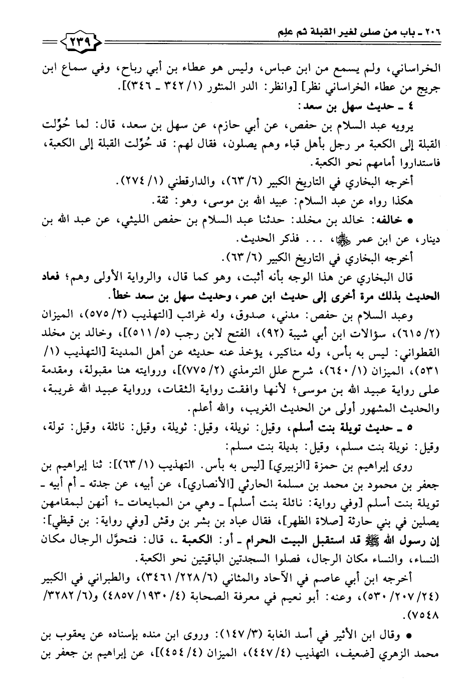 روى إبراهيم بن حمزة [الزبيري] [ليس به بأس. التهذيب (١/ ٦٣)]: ثنا إبراهيم بن جعفر بن محمود بن محمد بن مسلمة الحارثي [الأنصاري]، عن أبيه، عن جدته - أم أبيه - تويلة بنت أسلم [وفي رواية: نائلة بنت أسلم]- وهي من المبايعات -؛ أنهن لبمقامهن يصلين في بني حارثة [صلاة الظهر]، فقال عباد بن بشر بن وقش [وفي رواية: بن قيظي]: إن رسول الله - صلى الله عليه وسلم - قد استقبل البيت الحرام - أو: الكعبة -، قال: فتحوَّل الرجال مكان النساء، والنساء مكان الرجال، فصلوا السجدتين الباقيتين نحو الكعبة.