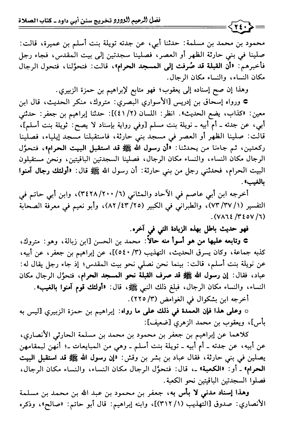 • ورواه إسحاق بن إدريس [الأسواري البصري: متروك، منكر الحديث، قال ابن معين: "كذاب، يضع الحديث". انظر: اللسان (٢/ ٤١)]: حدثنا إبراهيم بن جعفر: حدثني أبي، عن جدته - أم أبيه - نويلة بنت مسلم [وفي رواية بإسناد لا يصح: ثويلة بنت أسلم]، قالت: صلينا الظهر أو العصر في مسجد بني حارثة، فاستقبلنا مسجد إيلياء، فصلينا ركعتين، ثم جاءنا من يحدثنا: "أن رسول الله - صلى الله عليه وسلم - قد استقبل البيت الحرام"، فتحوَّل الرجال مكان النساء، والنساء مكان الرجال، فصلينا السجدتين الباقيتين، ونحن مستقبلون البيت الحرام، فحدثني رجل من بني حارثة: أن رسول الله - صلى الله عليه وسلم - قال: "أولئك رجال آمنوا بالغيب".