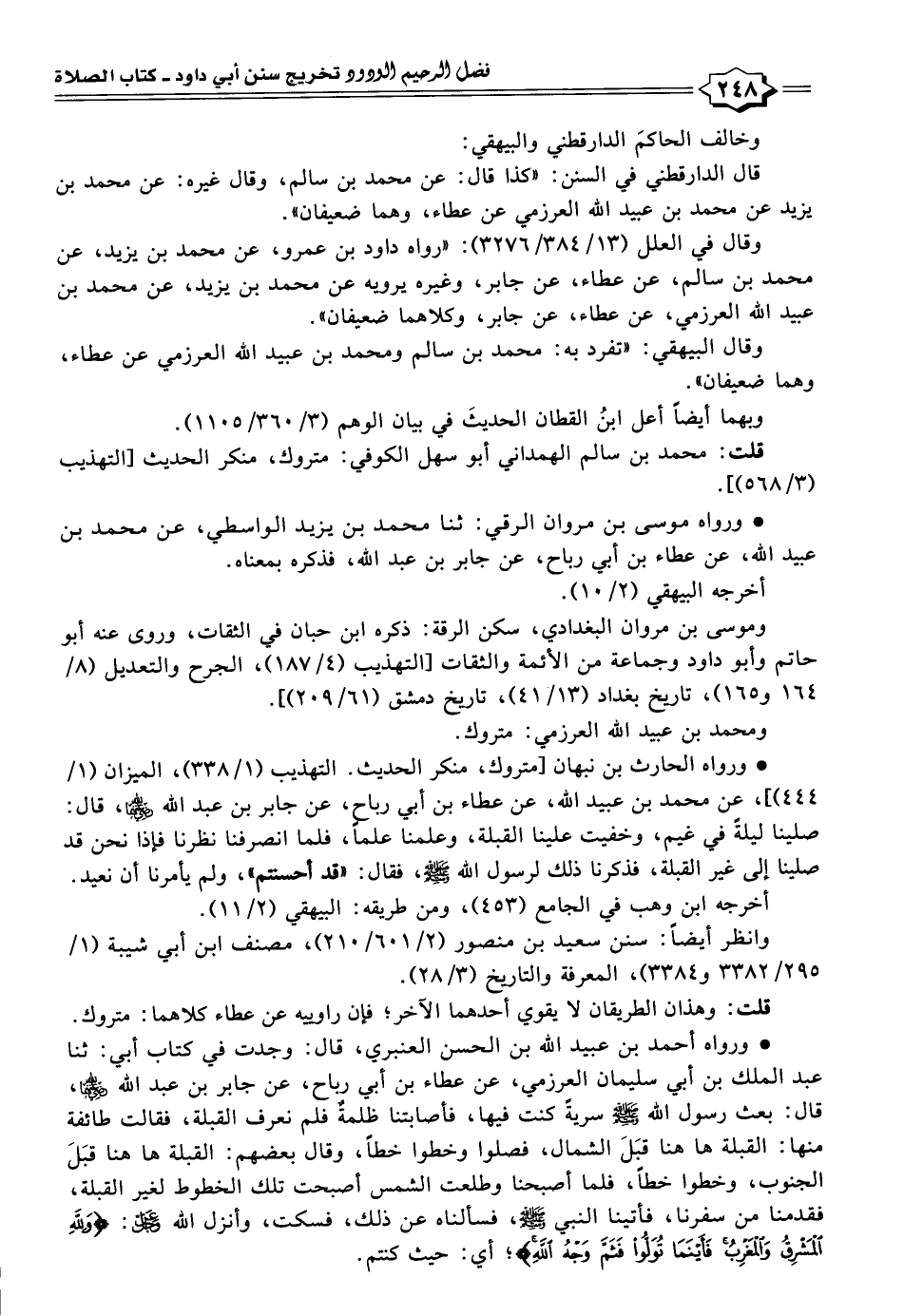 • ورواه الحارث بن نبهان [متروك، منكر الحديث. التهذيب (١/ ٣٣٨)، الميزان (١/ ٤٤٤)]، عن محمد بن عبيد الله، عن عطاء بن أبي رباحٍ، عن جابر بن عبد الله - رضي الله عنهما -، قال: صلينا ليلةً في غيم، وخفيت علينا القبلة، وعلمنا علمًا، فلما انصرفنا نظرنا فإذا نحن قد صلينا إلى غير القبلة، فذكرنا ذلك لرسول الله - صلى الله عليه وسلم -، فقال: "قد أحسنتم"، ولم يأمرنا أن نعيد.